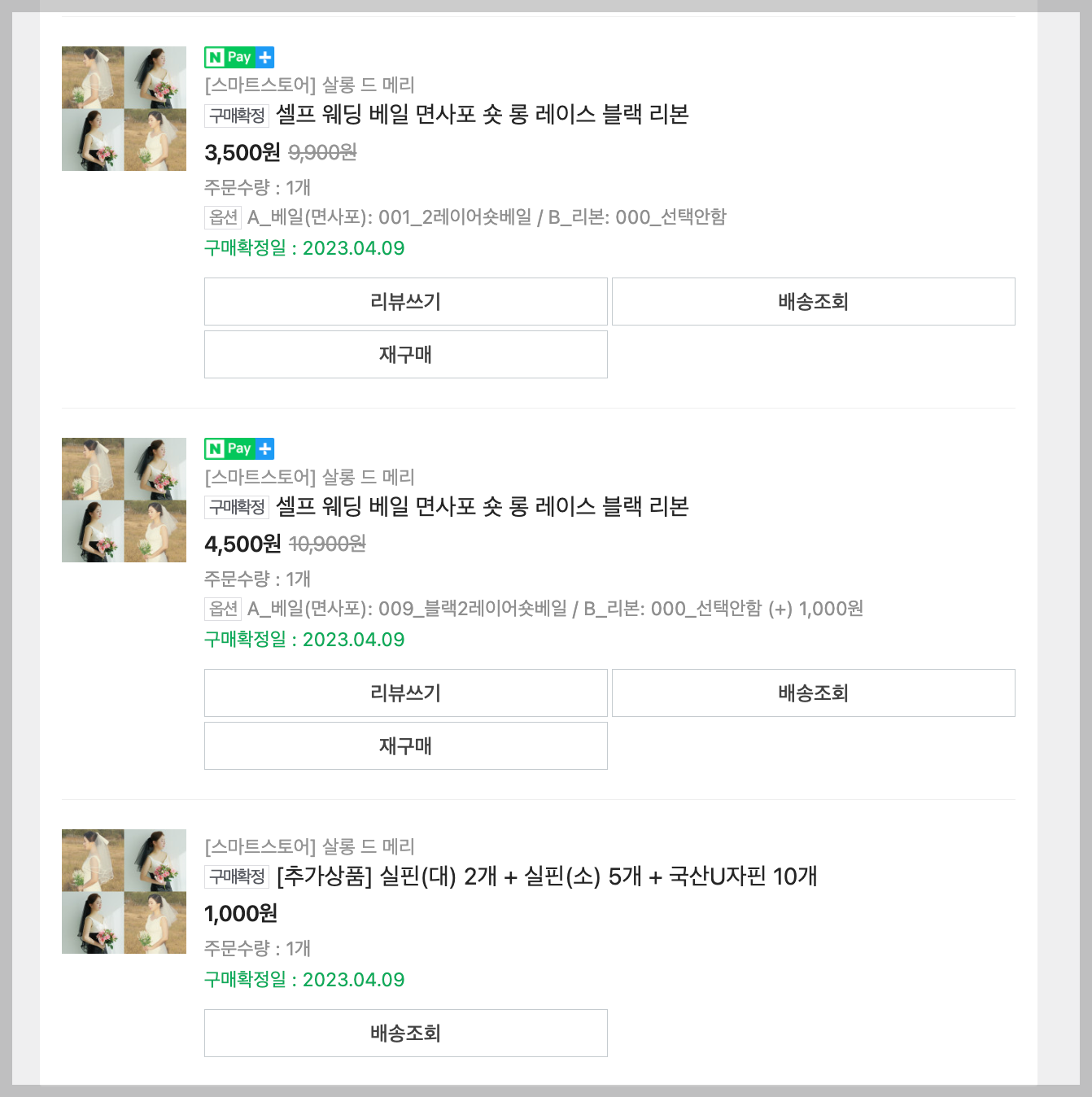 흰색 레이어 숏베일 3,500원, 블랙 레이어 숏베일 4,500원, 실핀 추가 1,000원. 그리고 배송비 3,000원까지. 베일 구매비용은 총 12,000원이 들었다.