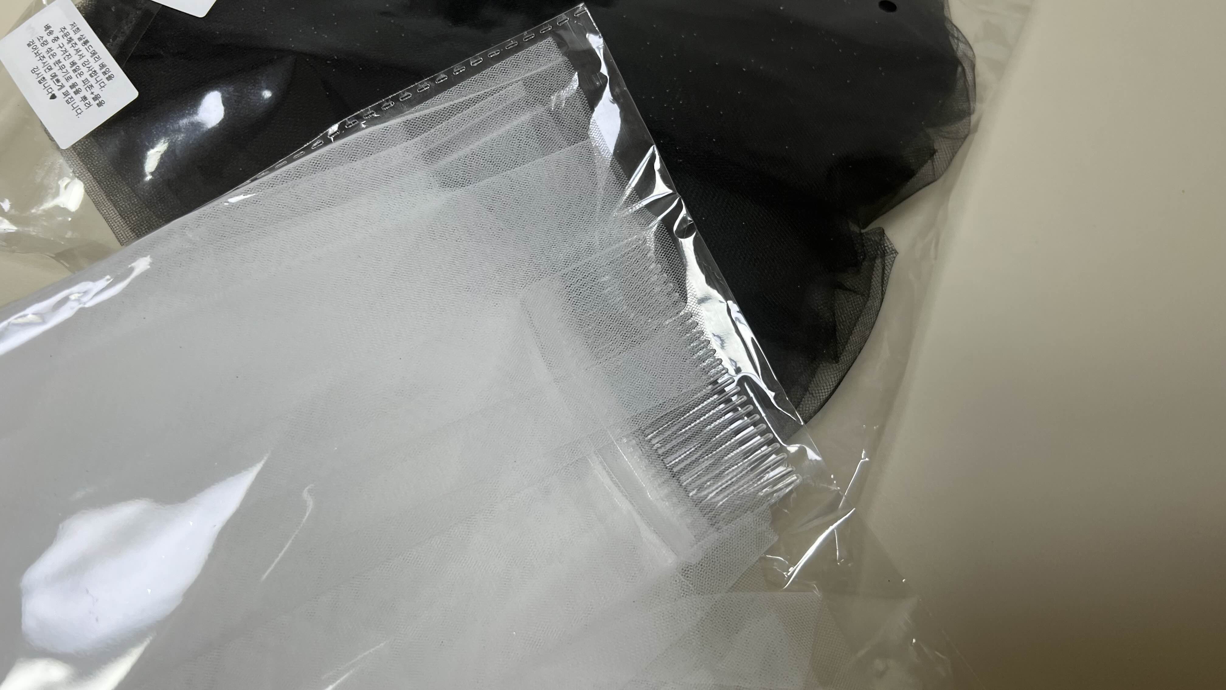처음에 도착했을 때 베일이 접혀있어서 굉장히 주름이 자글자글 거렸다. 물 분무기를 이용해서 물을 촥촥 뿌려주고 하루정도 걸어놓으니 주름이 다 펴졌다.