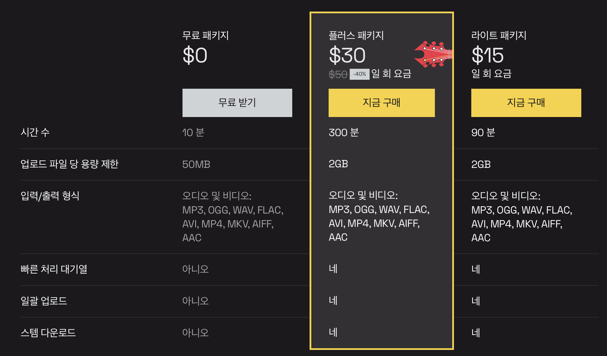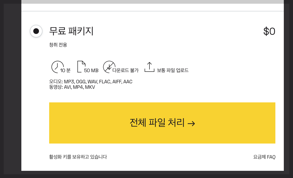 무료로 10분을 사용할 수 있지만, 파일을 다운로드 하는 건 불가능 합니다. 다만 지금 30$금액에 300분을 이용할 수 있는 요금제가 있으며, 한 번 구매를 하고나면 300분을 다 사용할때까지 기한 없이 필요할때마다 쭉 사용할 수 있습니다. 유료로 구매하기 전에, 파일 잡음 제거가 얼마나 잘 되는지 미리 들어볼 수 있으니, 사용해 보고 구매해도 늦지 않습니다.