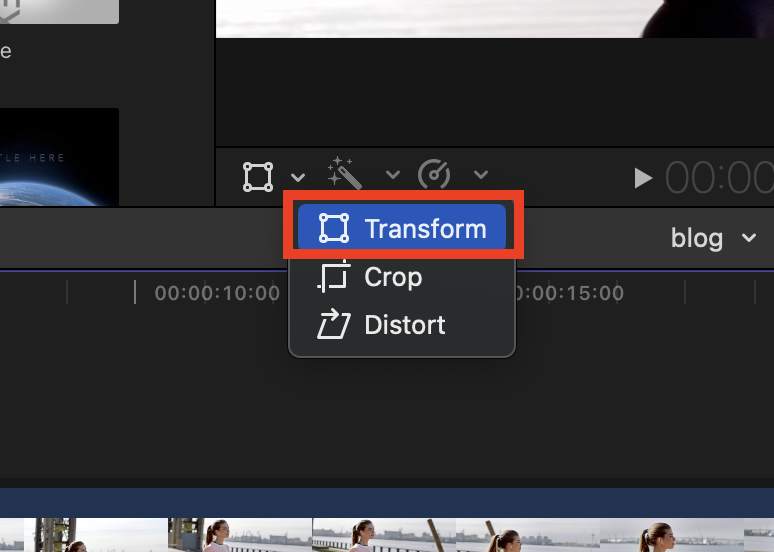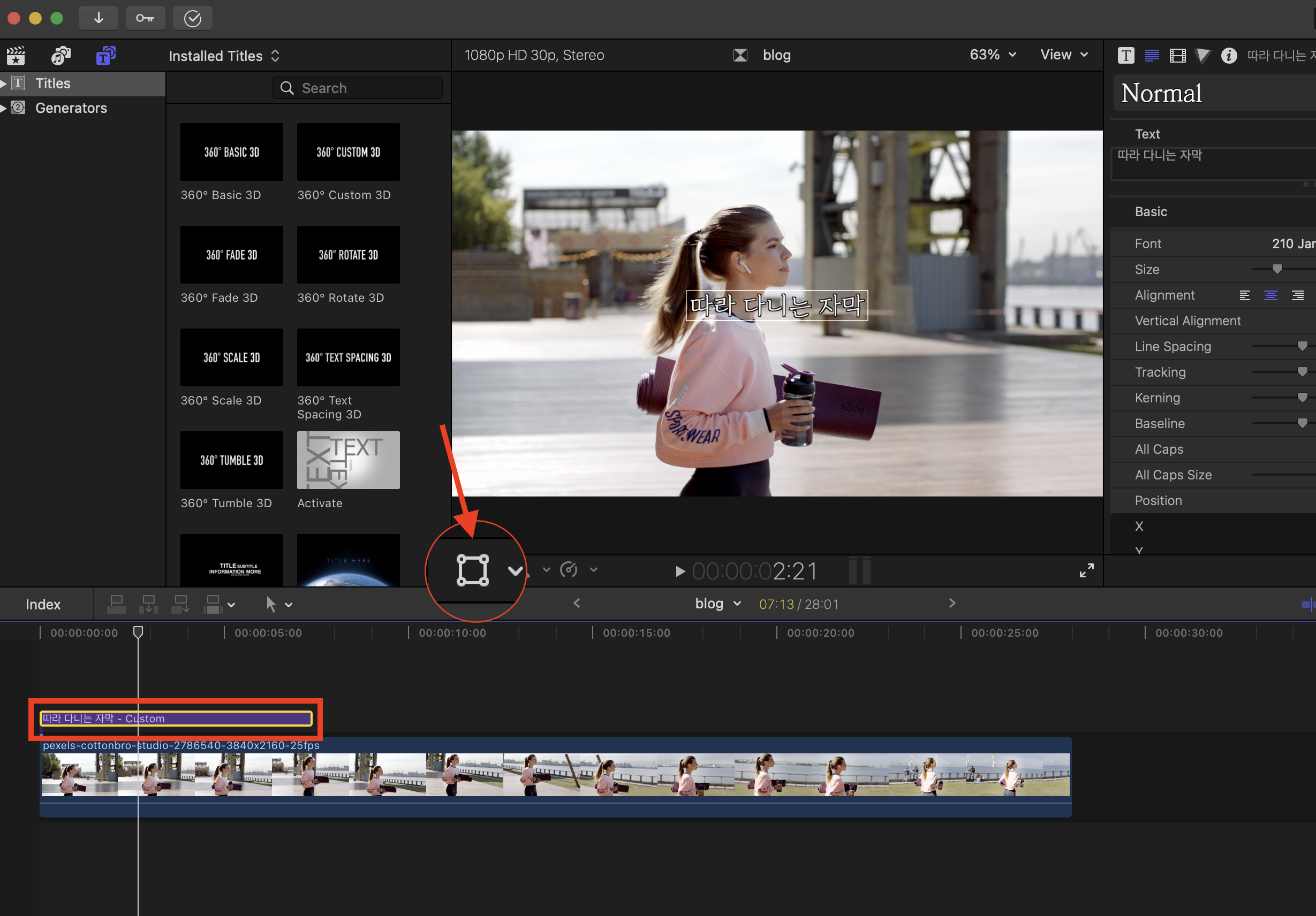 ▼ 먼저 자막과 영상을 미리 만들어 둔다. 그리고 자막을 선택 한 뒤, 미리보기 영상 아래에 있는 사각형 테두리에 동그라미가 있는 [Transform] 메뉴를 선택한다.