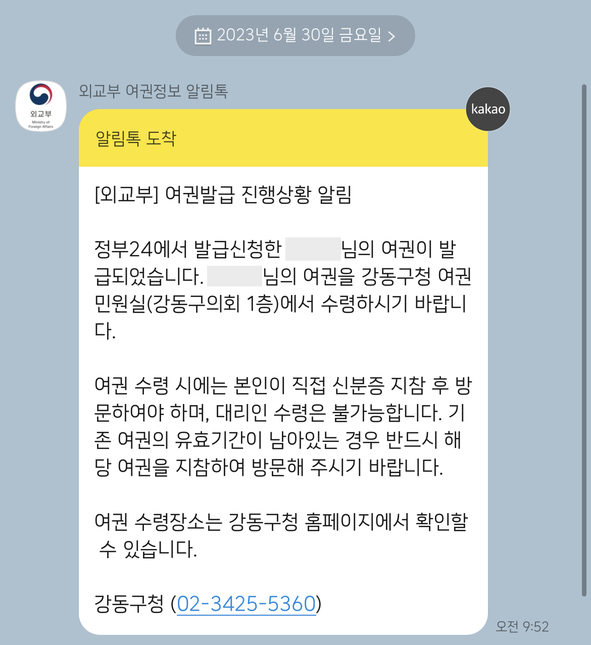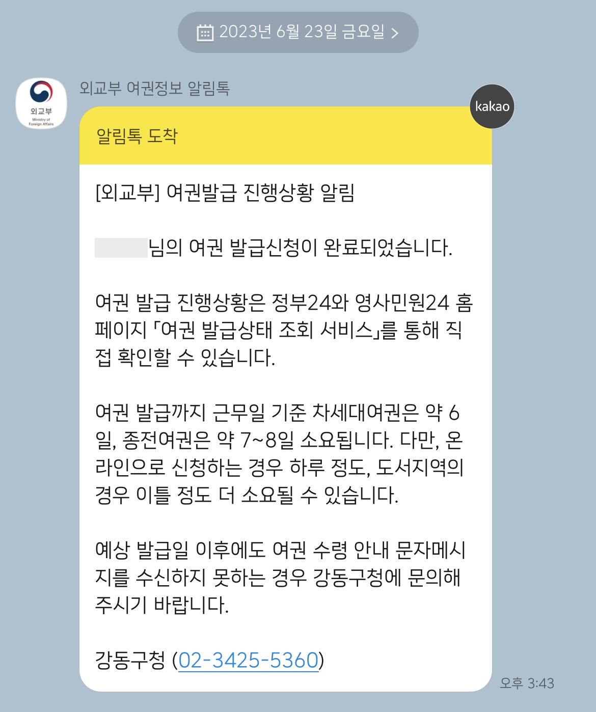 그렇다면 재발급이 완료 된 날짜는 언제인가. 바로 정확하게 1주일 뒤, 즉 7일 뒤인 2023년 6월 30일 금요일에 재발급이 완료되었다고 알림톡이 왔다.