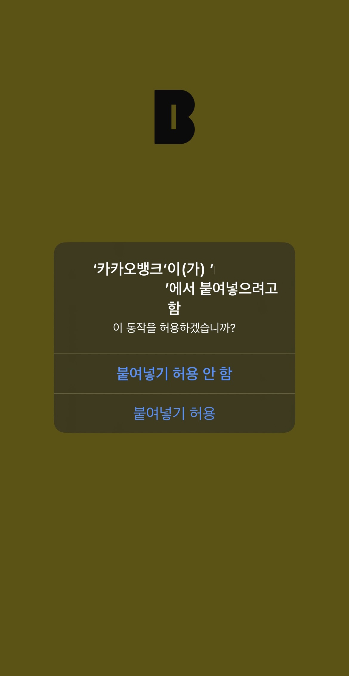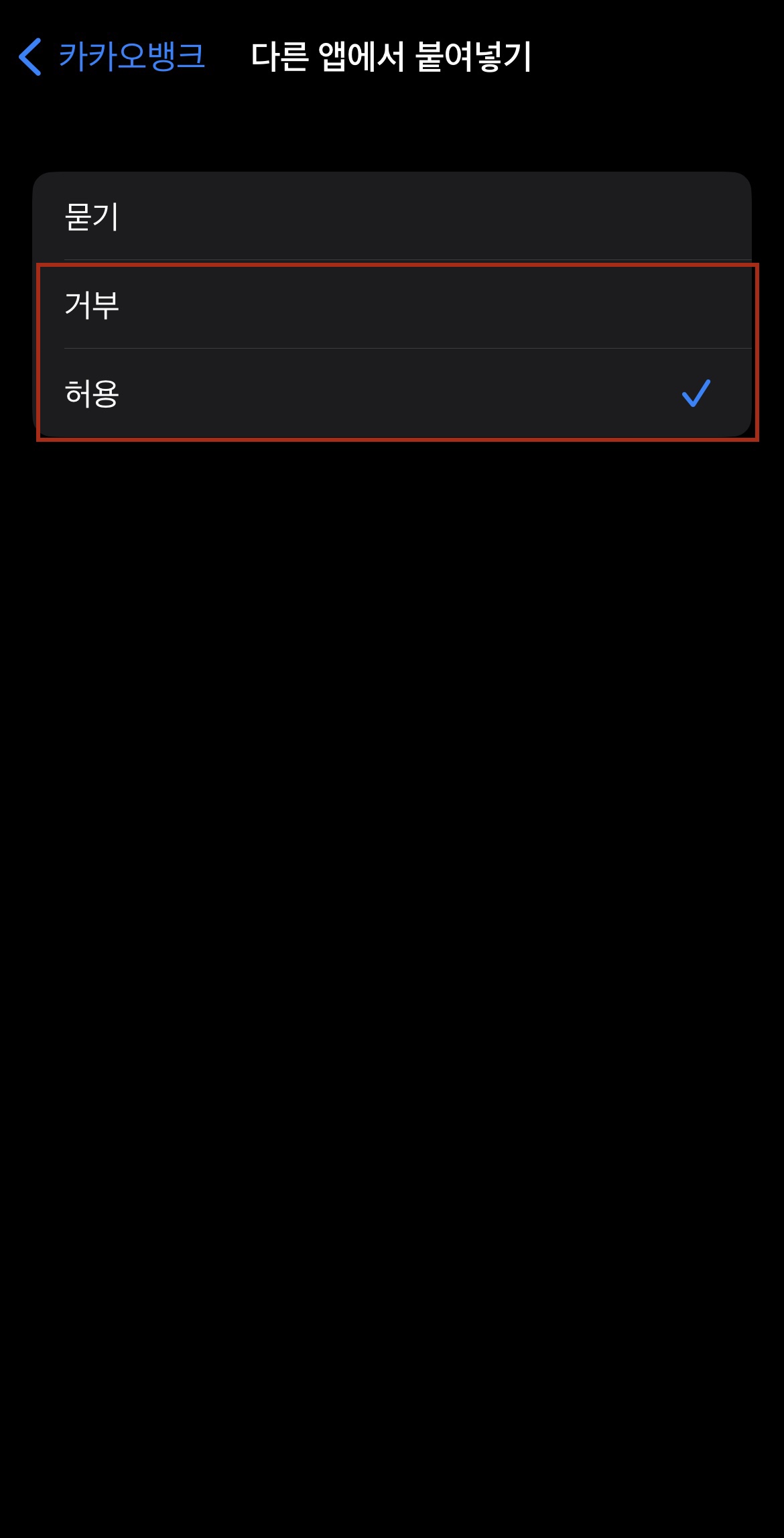 ▼ 여기서 항상 거부하려면 [거부], 항상 허용하려먼 [허용]으로 해준다. 은행 어플은 계좌를 복사하는 경우가 많기 때문에 항상 허용으로 해주었다.