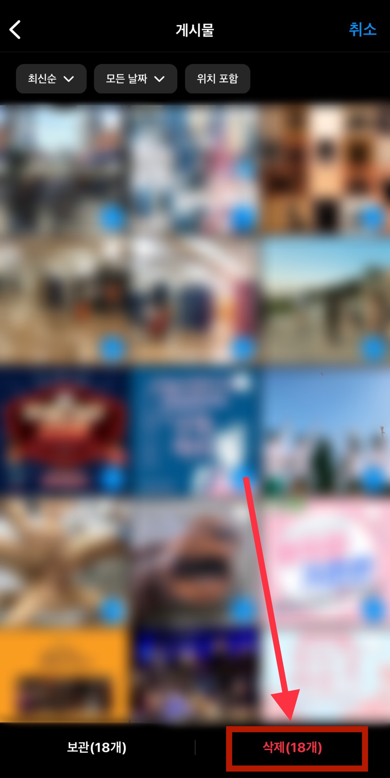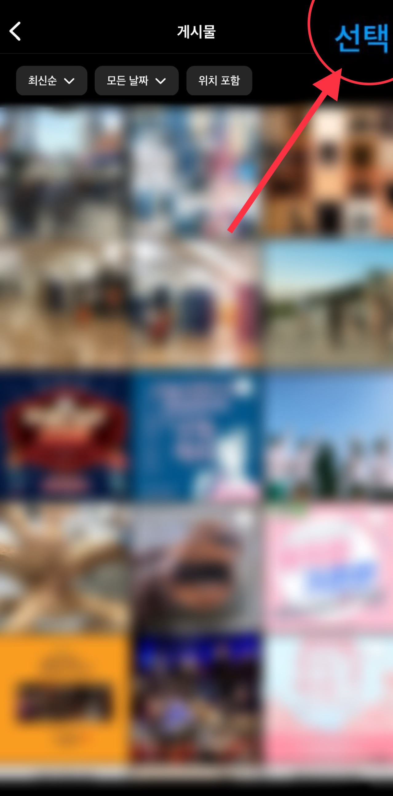▼ 이제 삭제해 줄 게시물들을 선택 하기 위해서 오른쪽 상단에 있는 [선택]을 누른다.