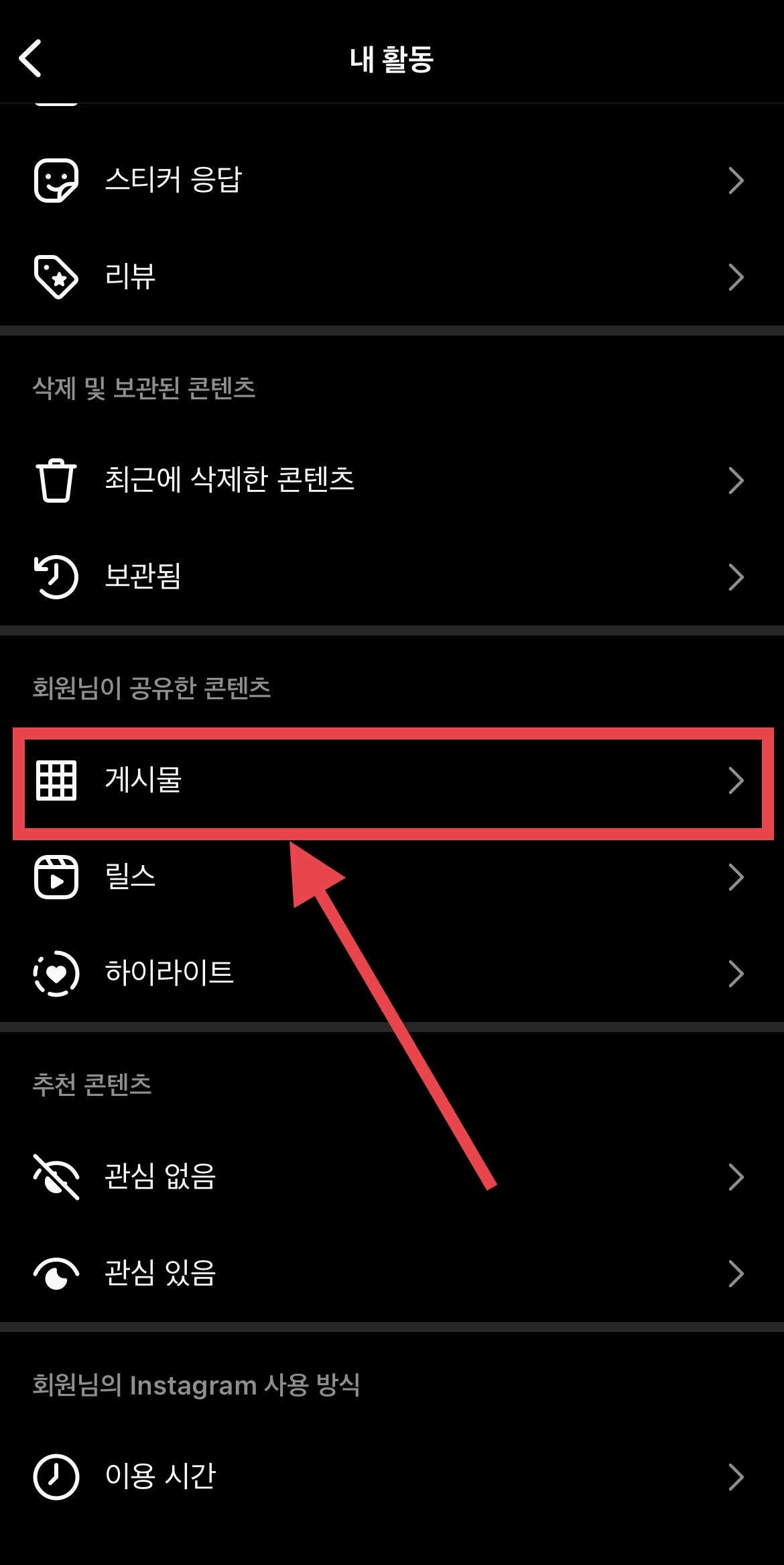▼ 내 활동 메뉴에서 중간에 있는 [게시물]을 선택한다.