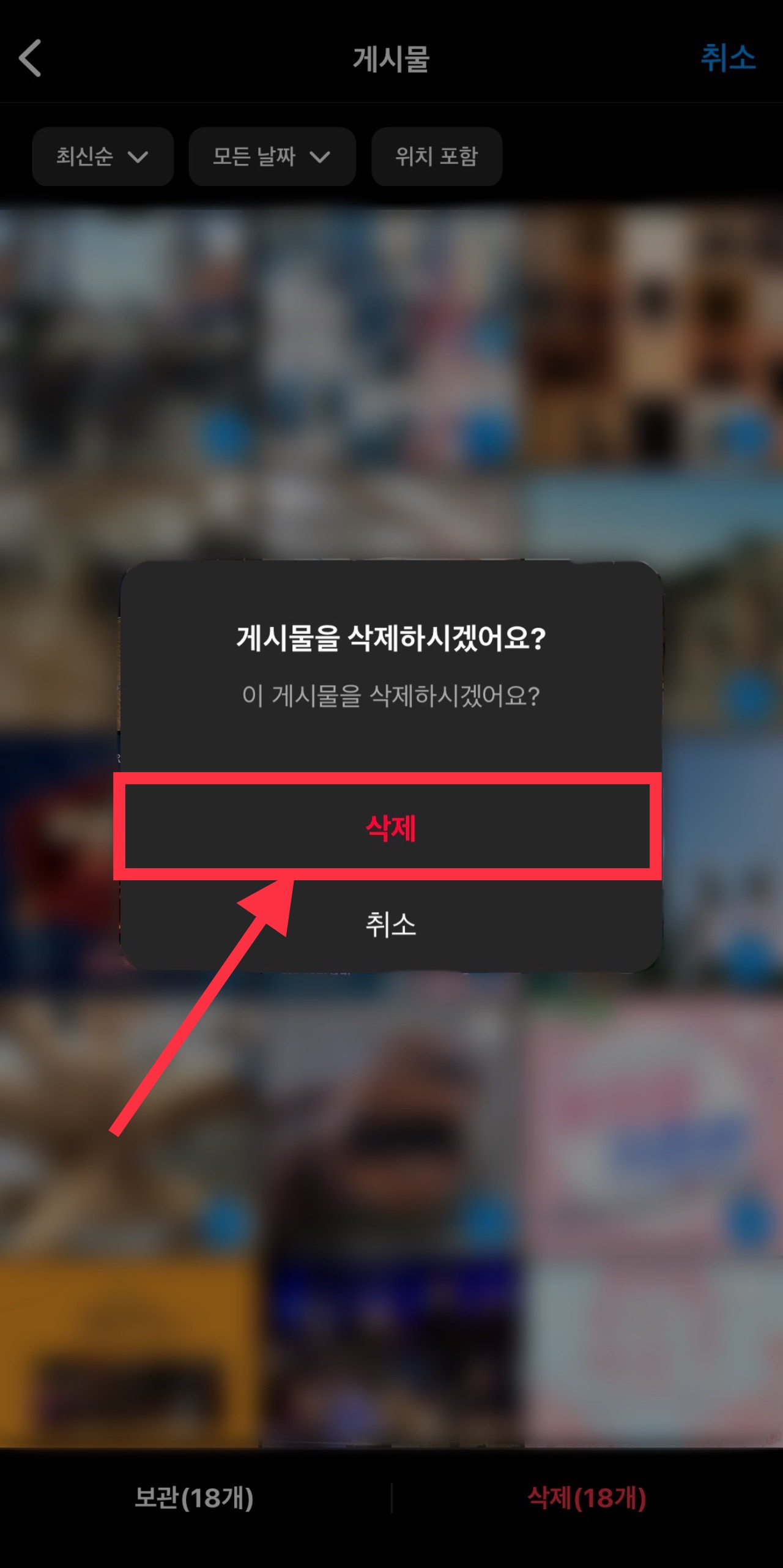 ▼ 게시물을 삭제하시겠어요? 라는 창이 나오면 [삭제]를 눌러준다.