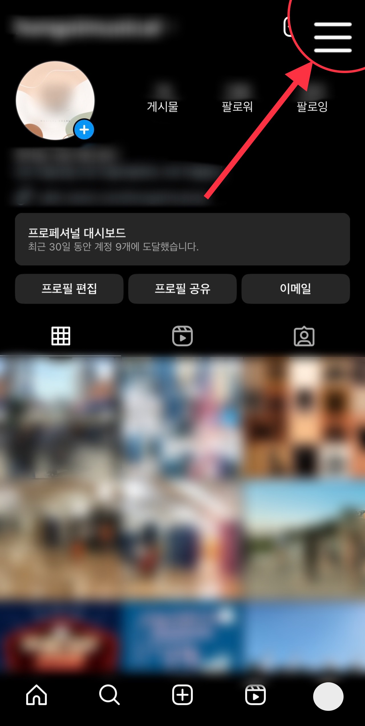 ▼ 인스타그램에서 오른쪽 상단에 있는 [선 세개] 메뉴를 누른다.