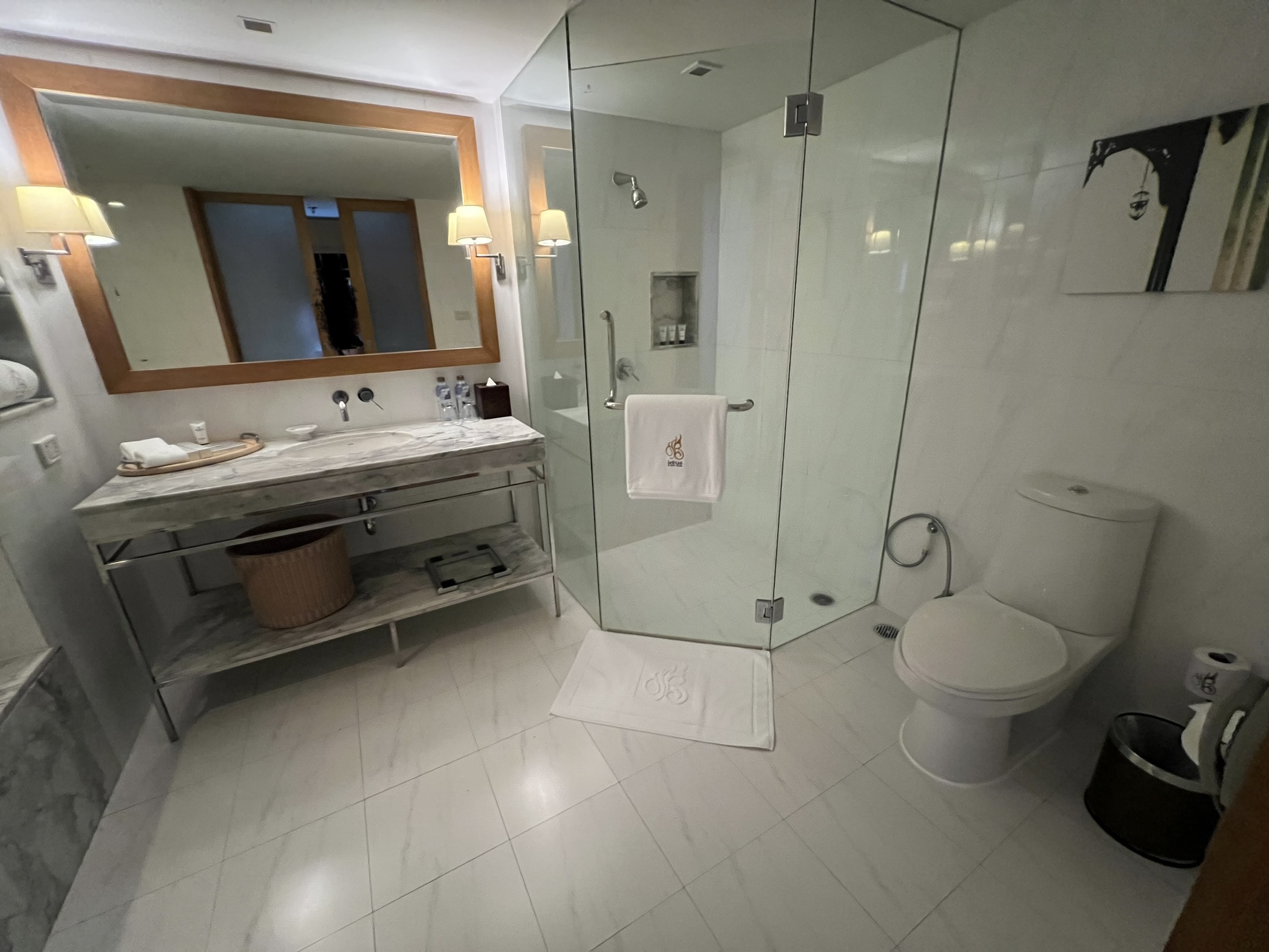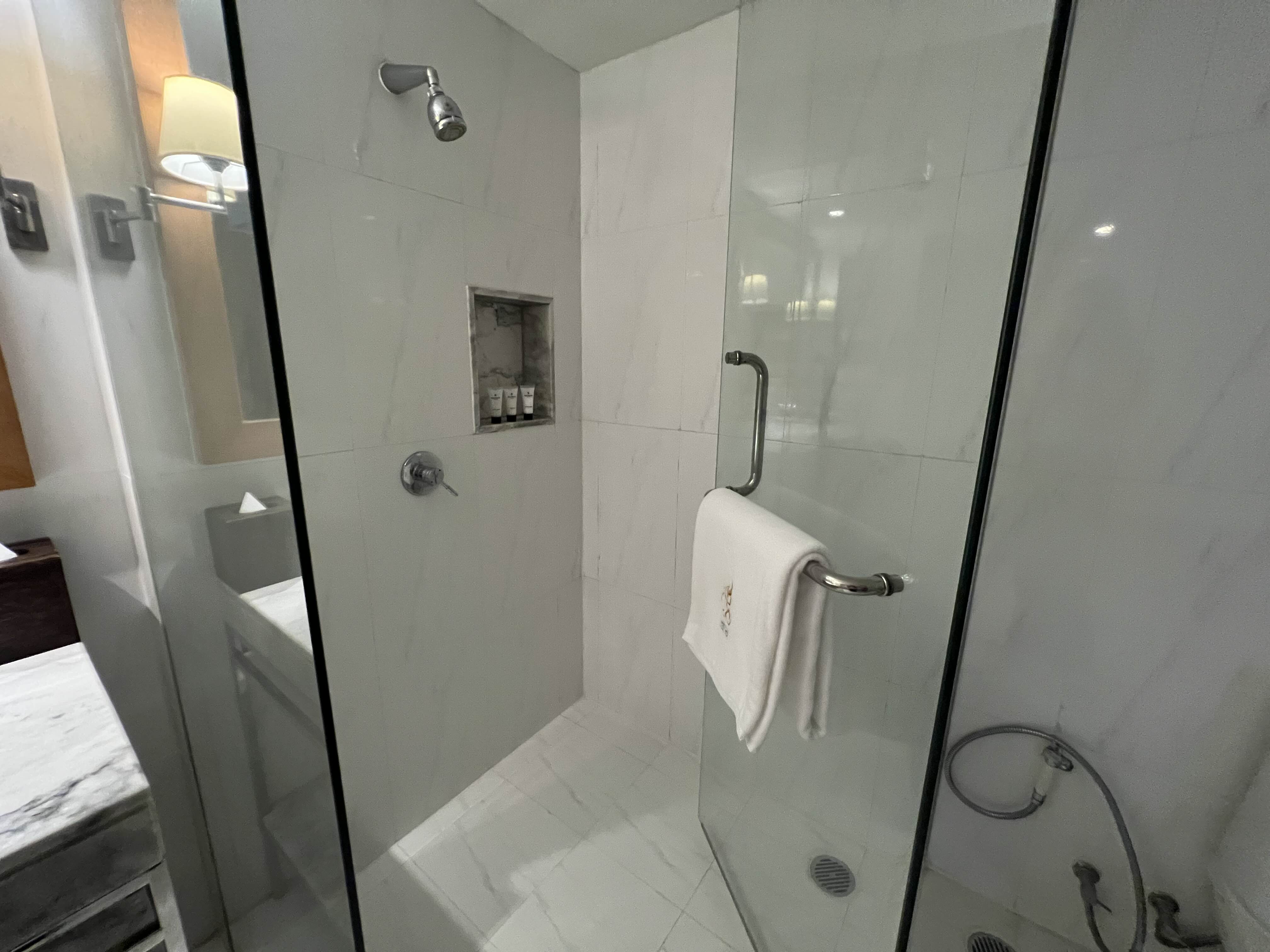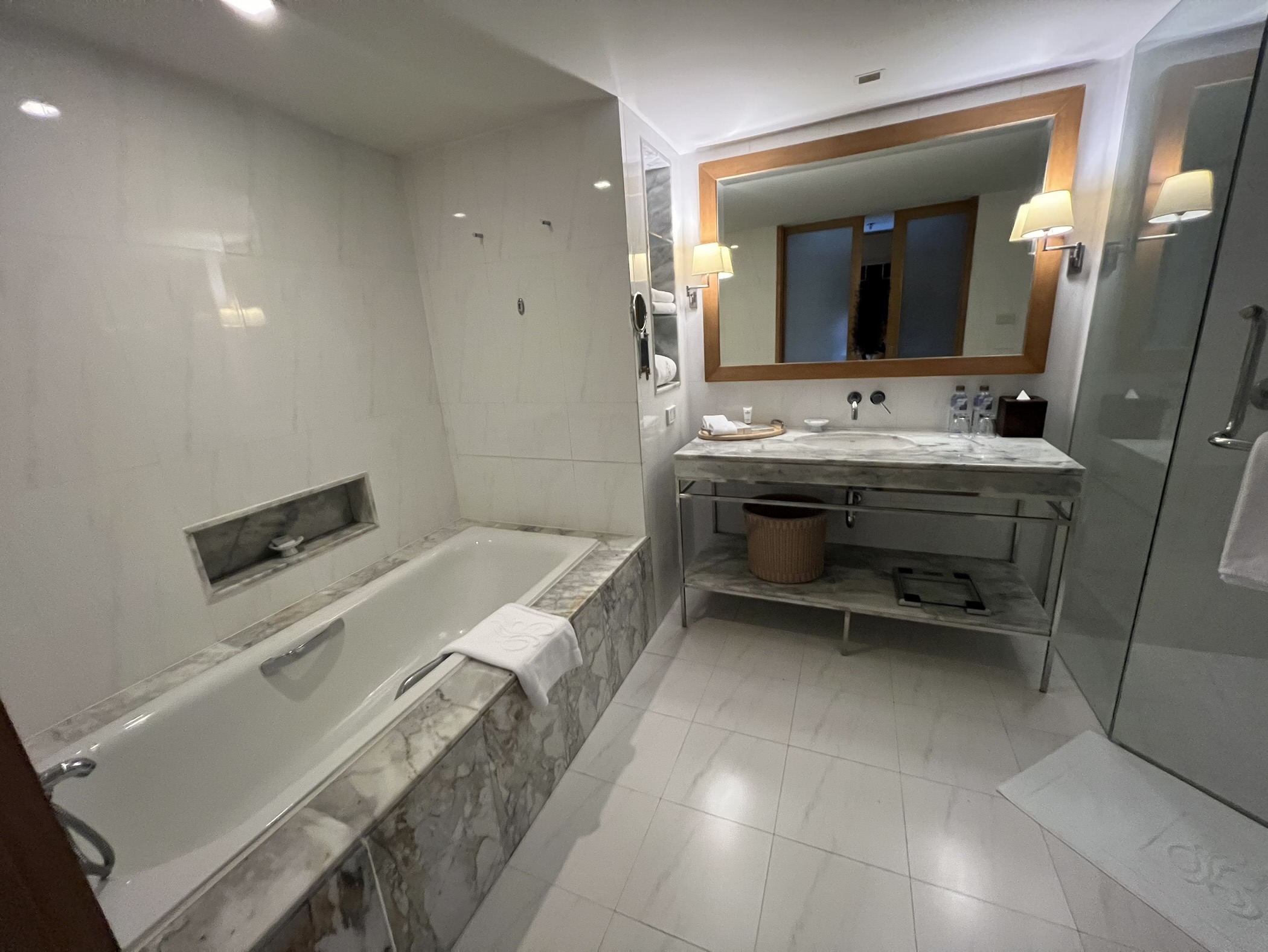 넓은 욕조와 샤워실. 자기 전에 욕조에서 반신욕을 했는데 매우 만족스러웠다.