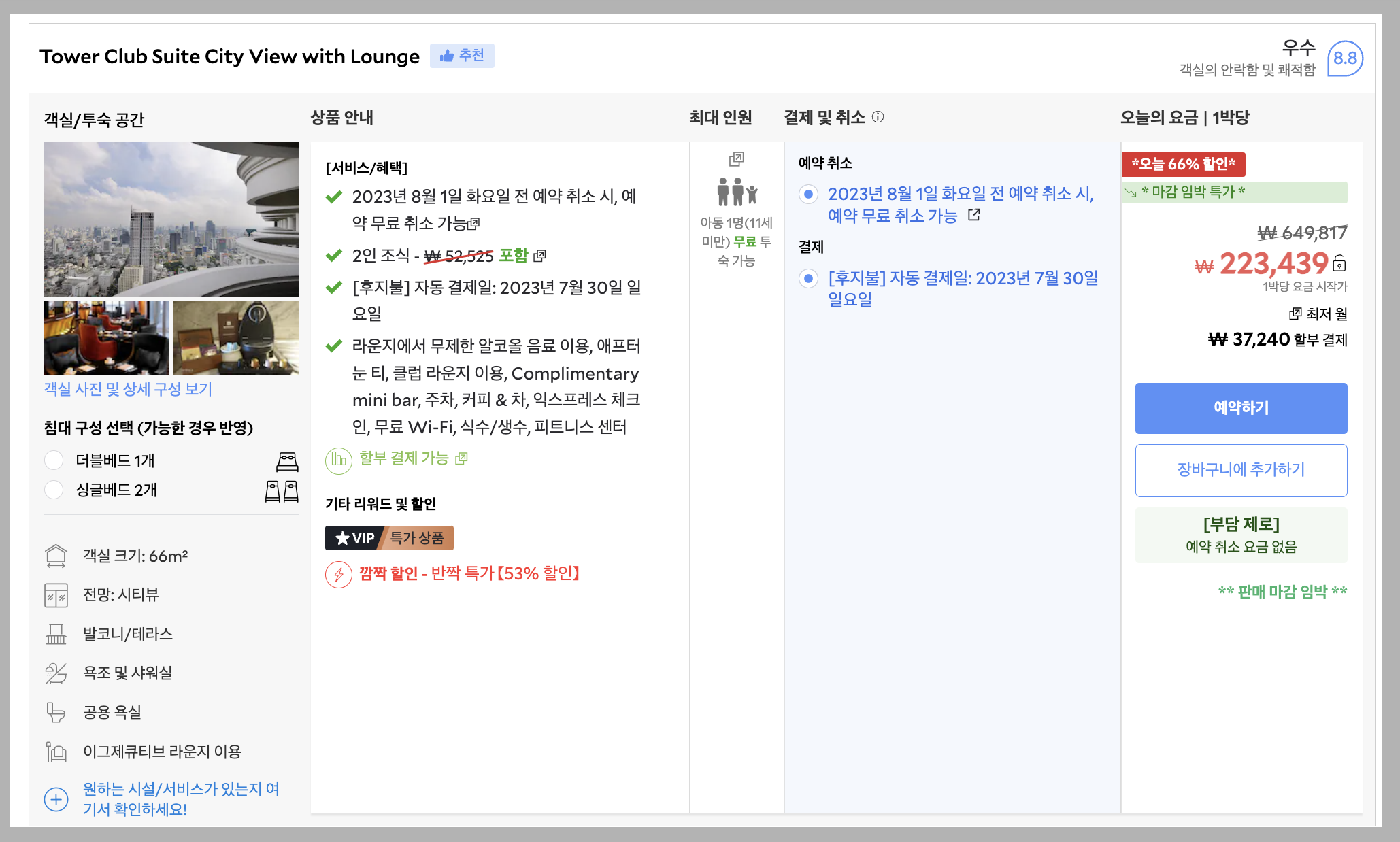 방콕 여행 3개월 전에 아고다에서 예약을 했고, 이름은 '타워 클럽 스위트 시티 뷰 위드 라운지' 였다.