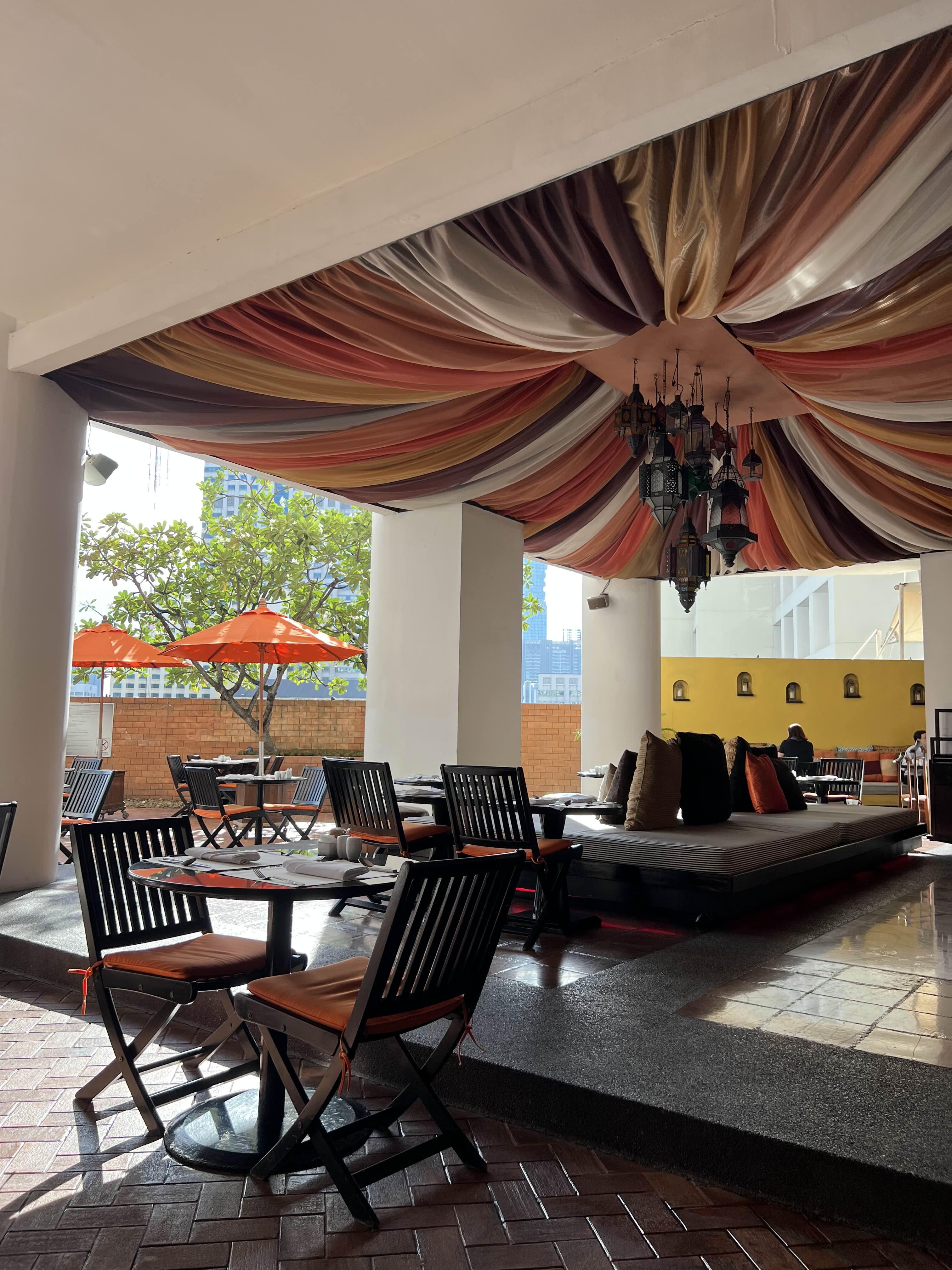 아침조식이 포함이라서 일찍부터 내려갔다. 더웠지만 야외 풍경을 보고 싶어서 야외에 자리를 잡았다.