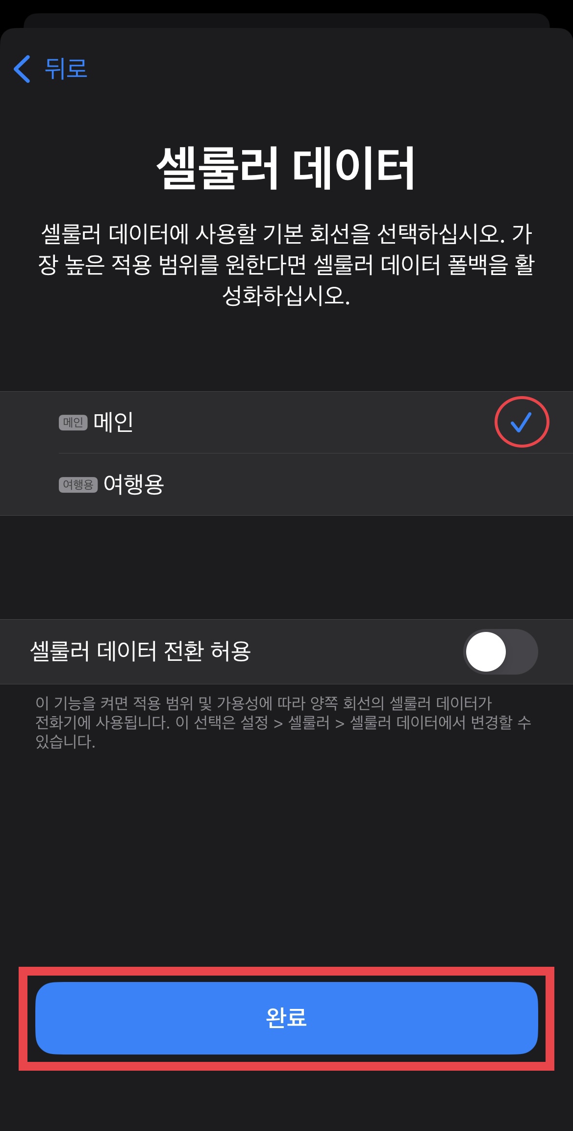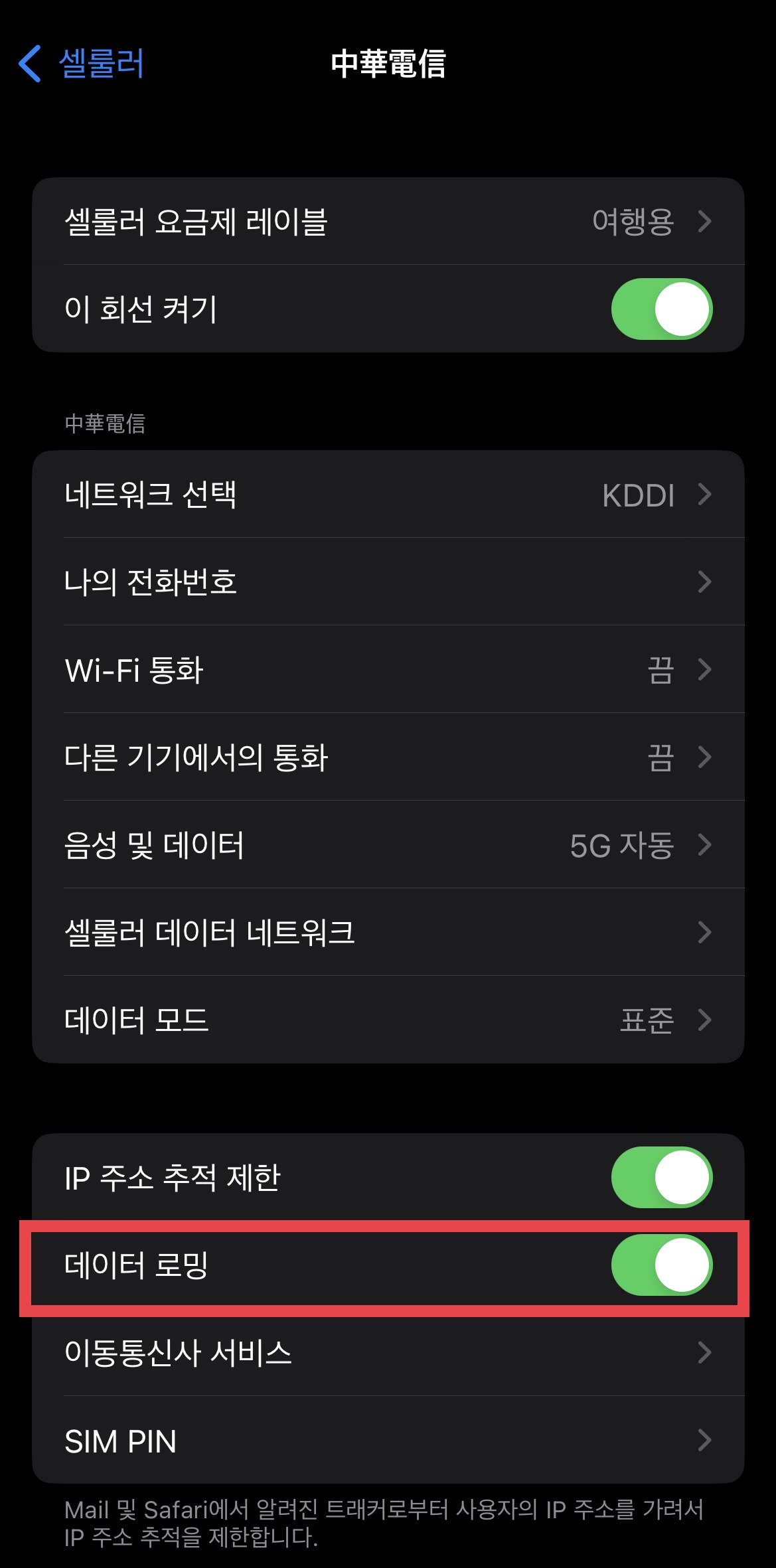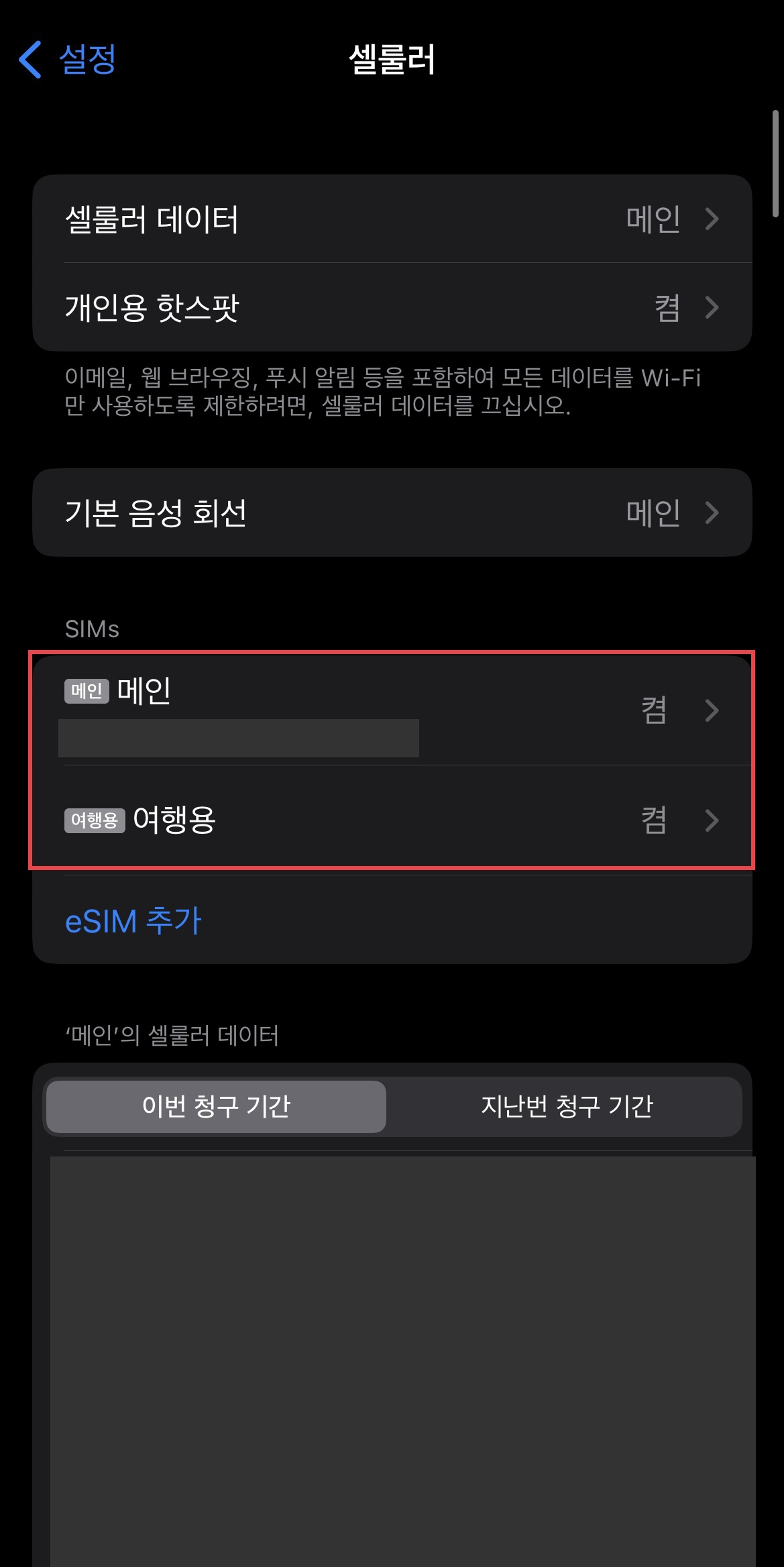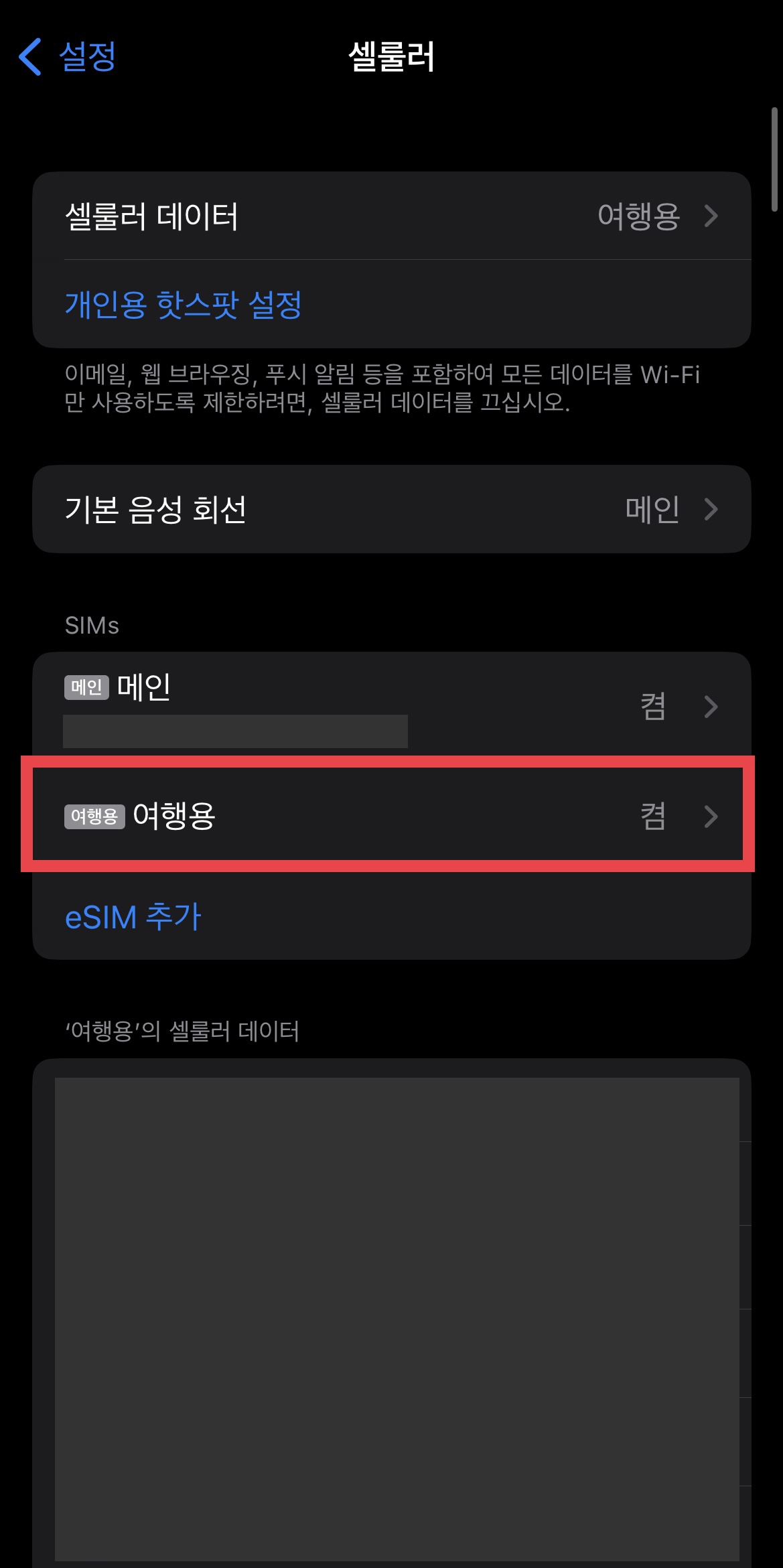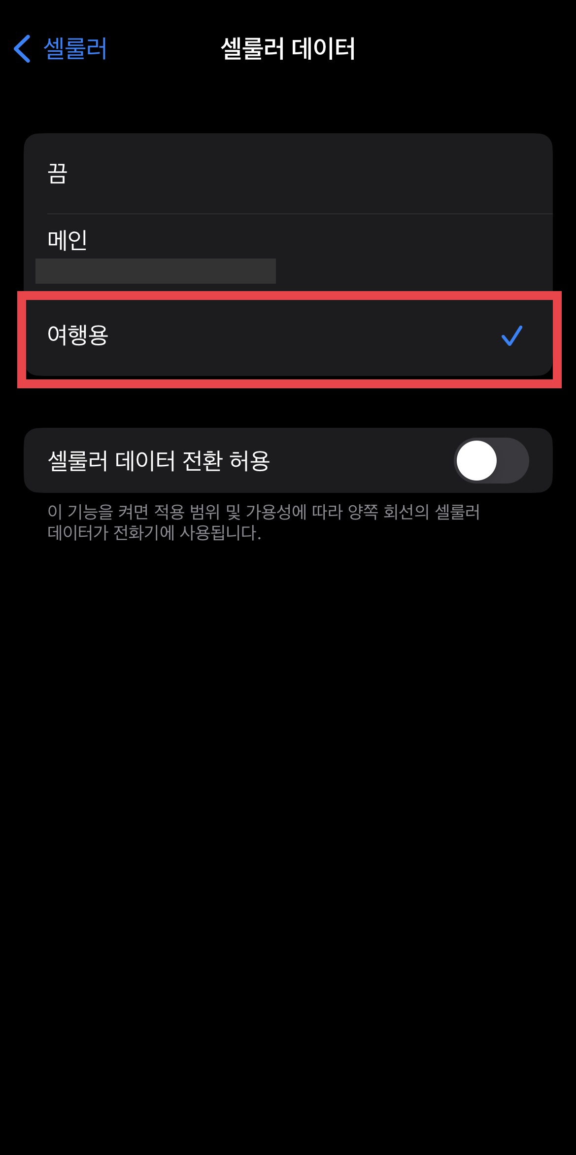 ▼ 이제 일본에 도착하면 [셀룰러]- [셀룰러데이터] 메뉴로 들어가서 ‘메인’으로 되어있던 것을 ‘여행용’으로 변경해준다.