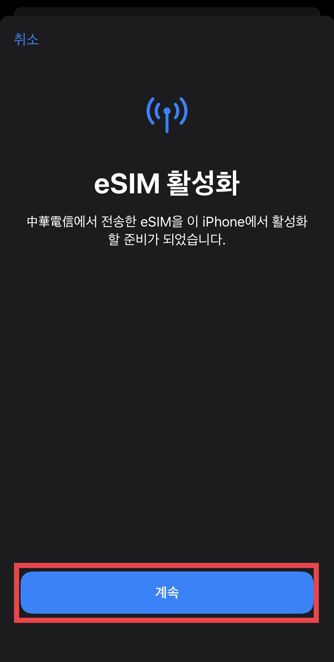 ▼ esIM활성화를 위해 계속을 누른다.