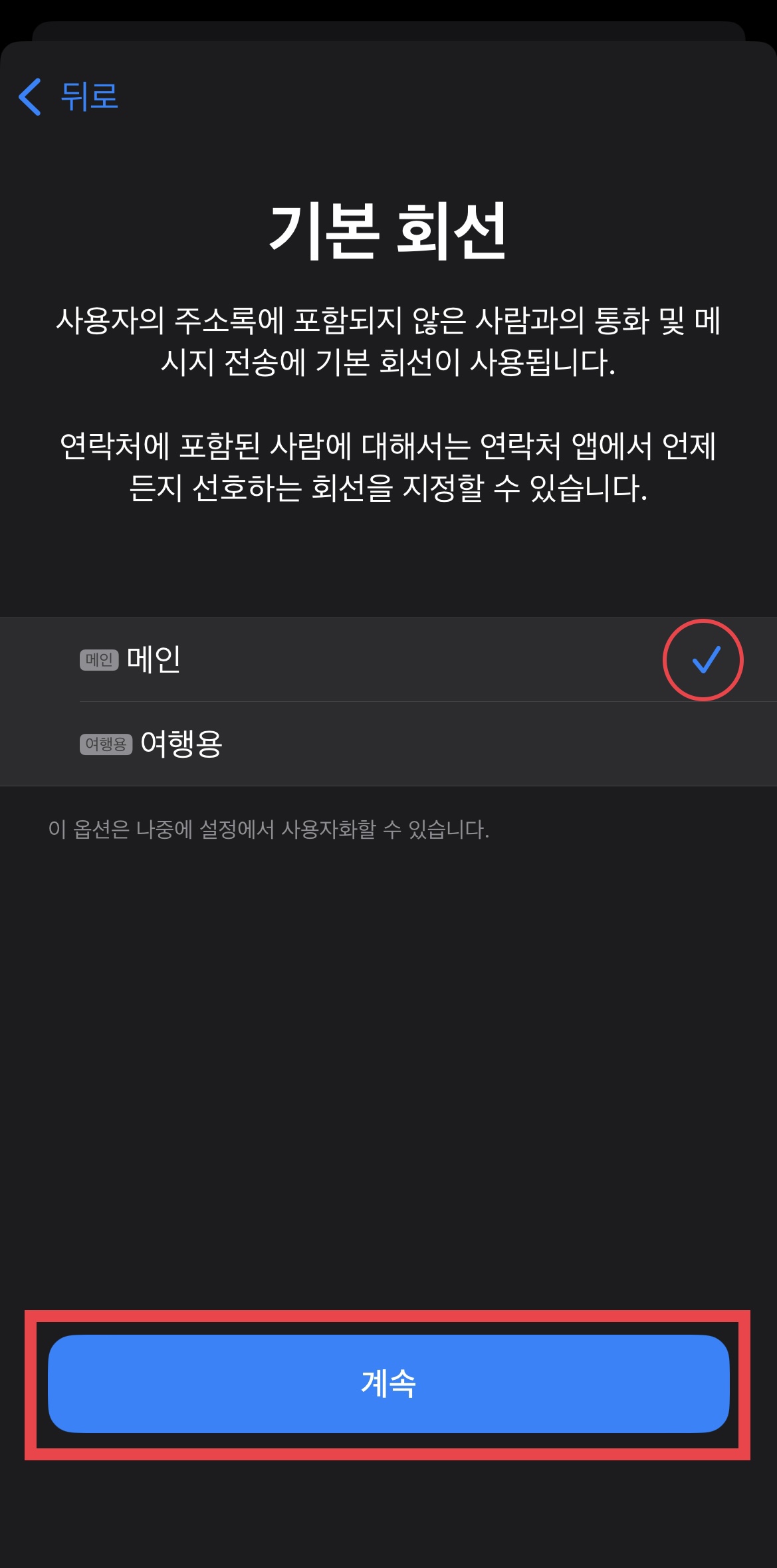 ▼ 기본 회선은 한국의 통신사인 ‘메인’을 선택한다.
