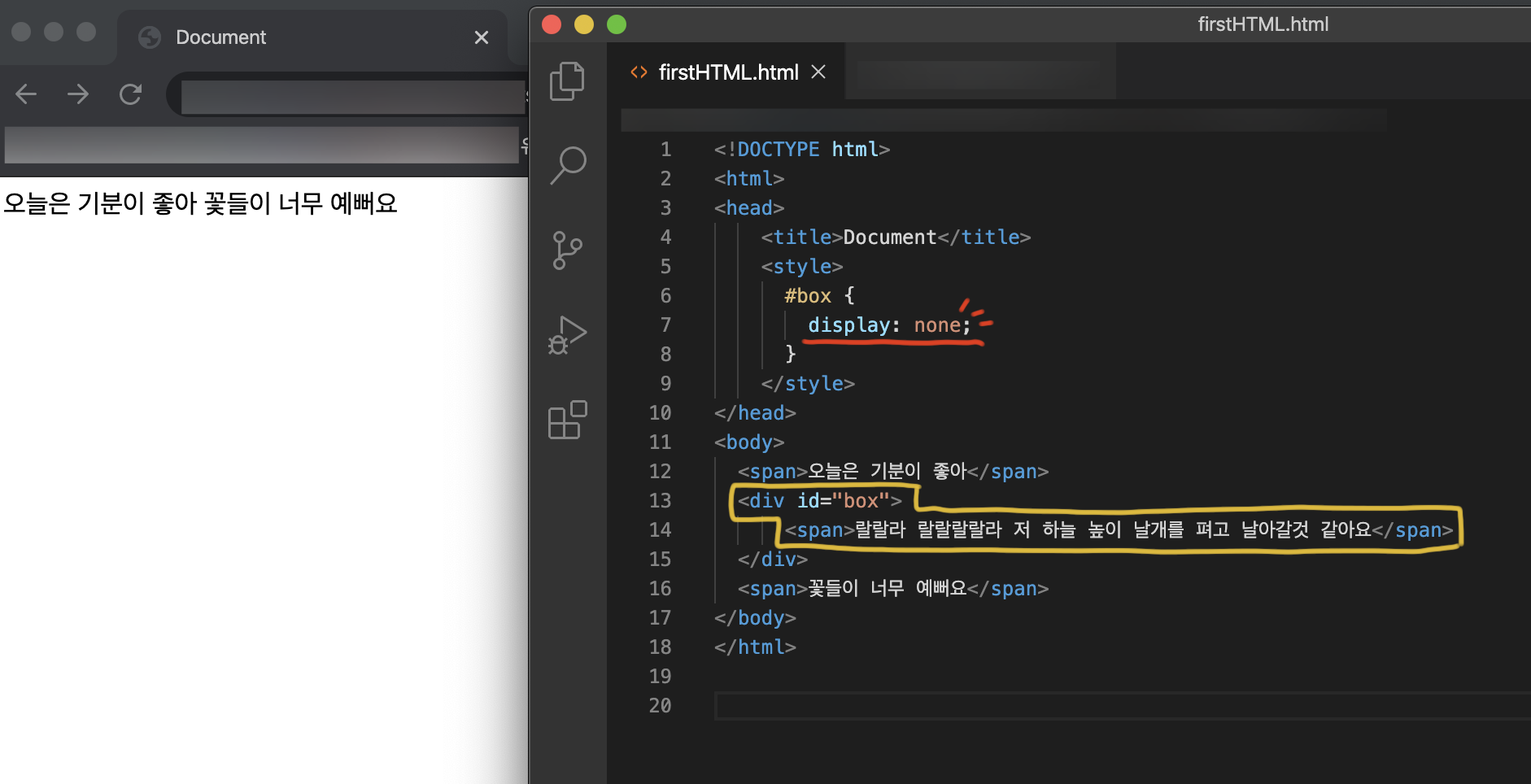 스타일시트에 display: none; 을 넣어주었더니, [랄랄라~] 부분이 텍스트와 공간까지 화면에서 사라진 것을 확인할 수 있습니다.