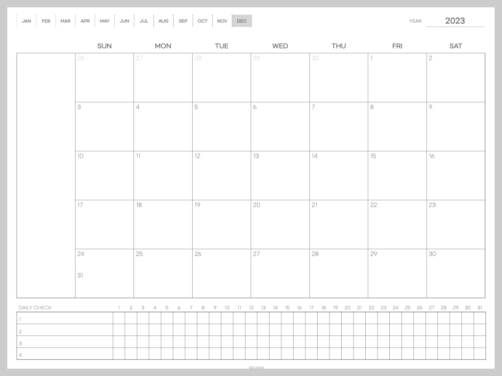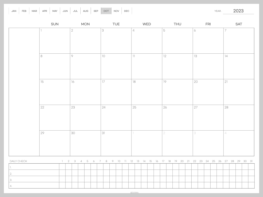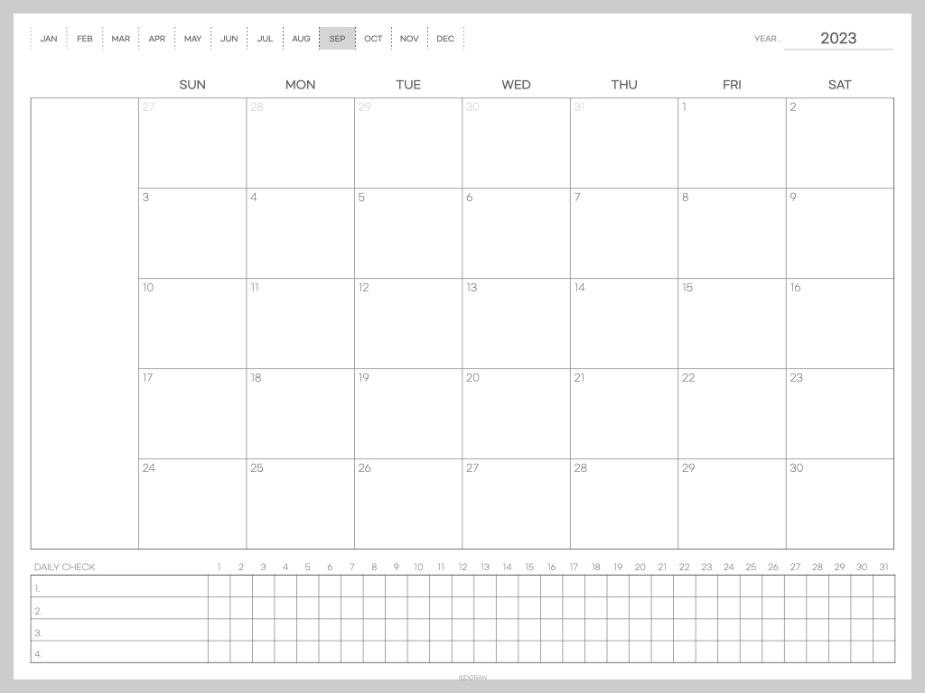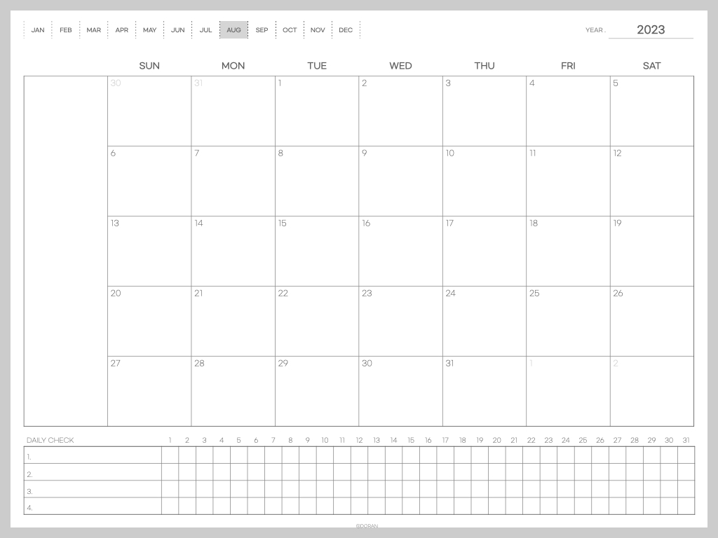안녕하세요 도란입니다. 오늘은 지난번에 공유해드렸던 먼슬리 다이어리 만년 서식에, 날짜가 기입된 버전을 가지고 왔어요. 사실 제가 사용하고 싶어서 만들었던서식인지라 날짜가 없으니 일일이 적어줘야해서 불편하더라고요. 그래서 2023년 8월부터 사용할 수 있도록 몇 장만 가지고 왔습니다.