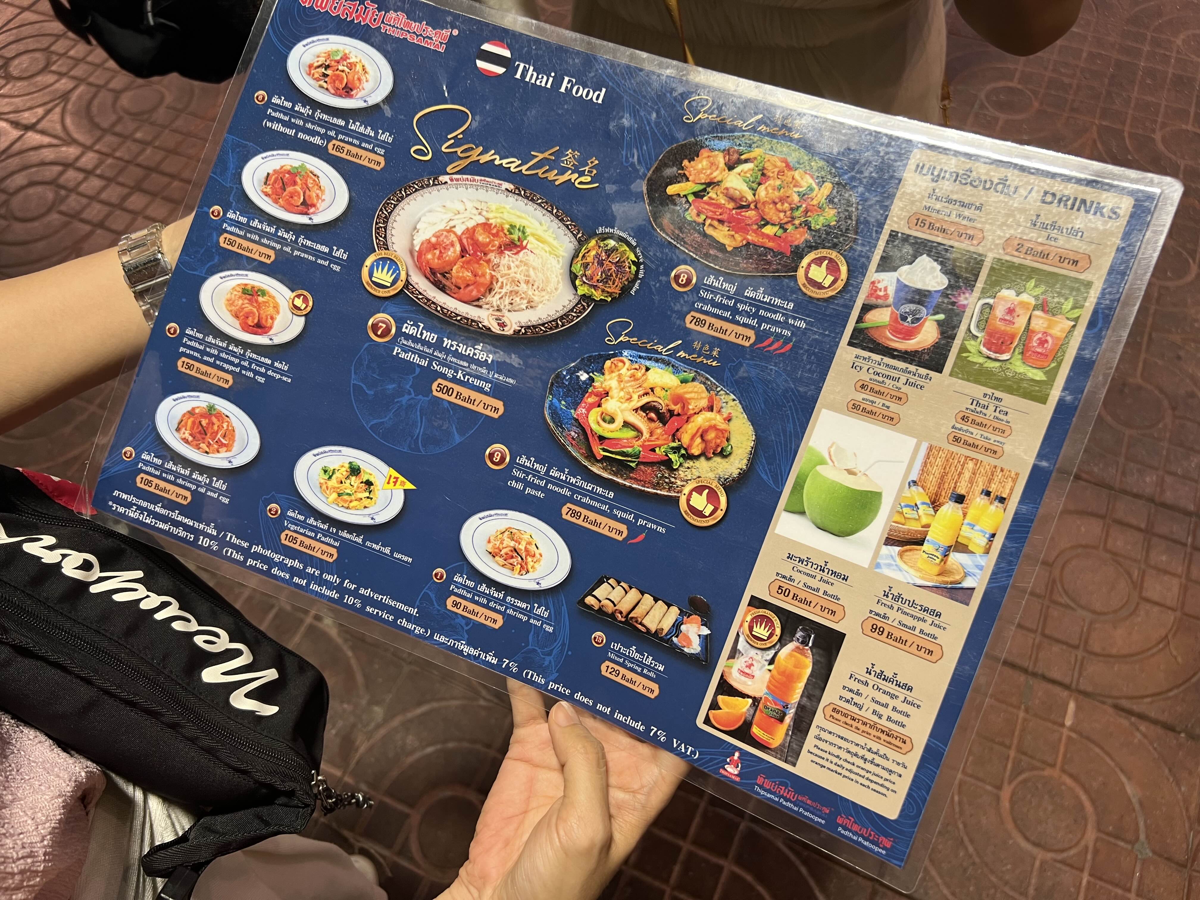 기다리는 동안 이렇게 메뉴판을 준다. 가장 유명한 메뉴는 계란에 둘러쌓여 나오는 4번 팟타이와, 오른쪽 아래에 있는 오렌지 쥬스이다.