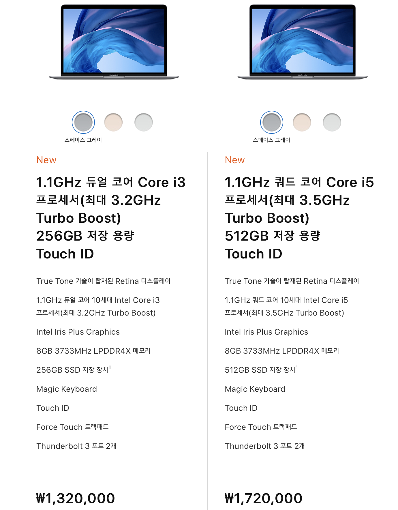 새롭게 등장한 맥북 에어에서 가장 큰 변화는 프로세서 입니다. 따라서 함께 빨라진 그래픽 처리속도, 그리고 용량이 더욱 늘어났습니다. 이번에 탑재된 프로세서는 인텔 10세대 프로세서가 탑재되어 기존 모델과는 차원이 다른 속도를 보여줄 것으로 보입니다.