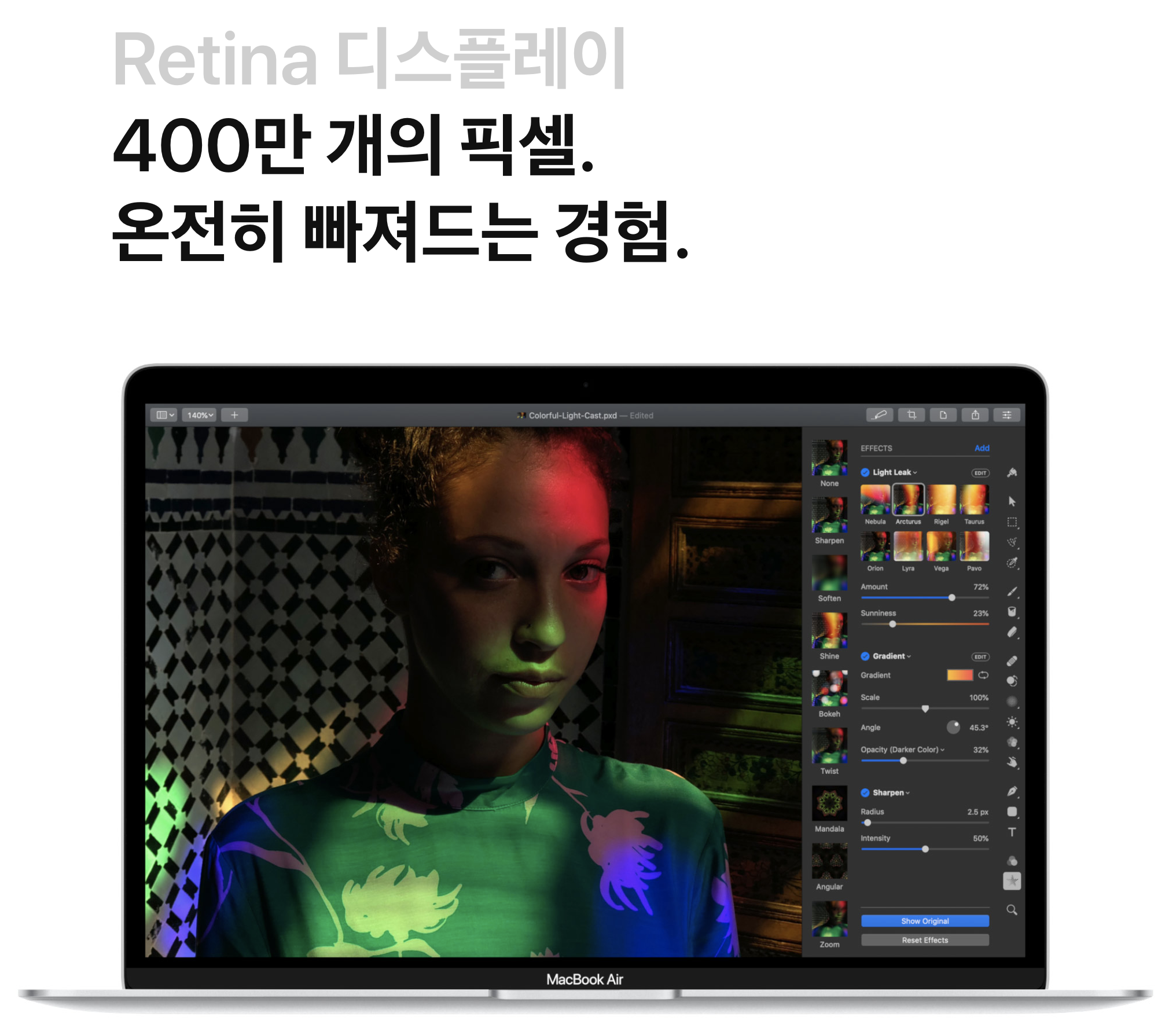 레티나 디스플레이는 기존 맥북 에어에 탑제된 디스플레이보다도 48% 더 풍부한 색상을 표현한다고 합니다.