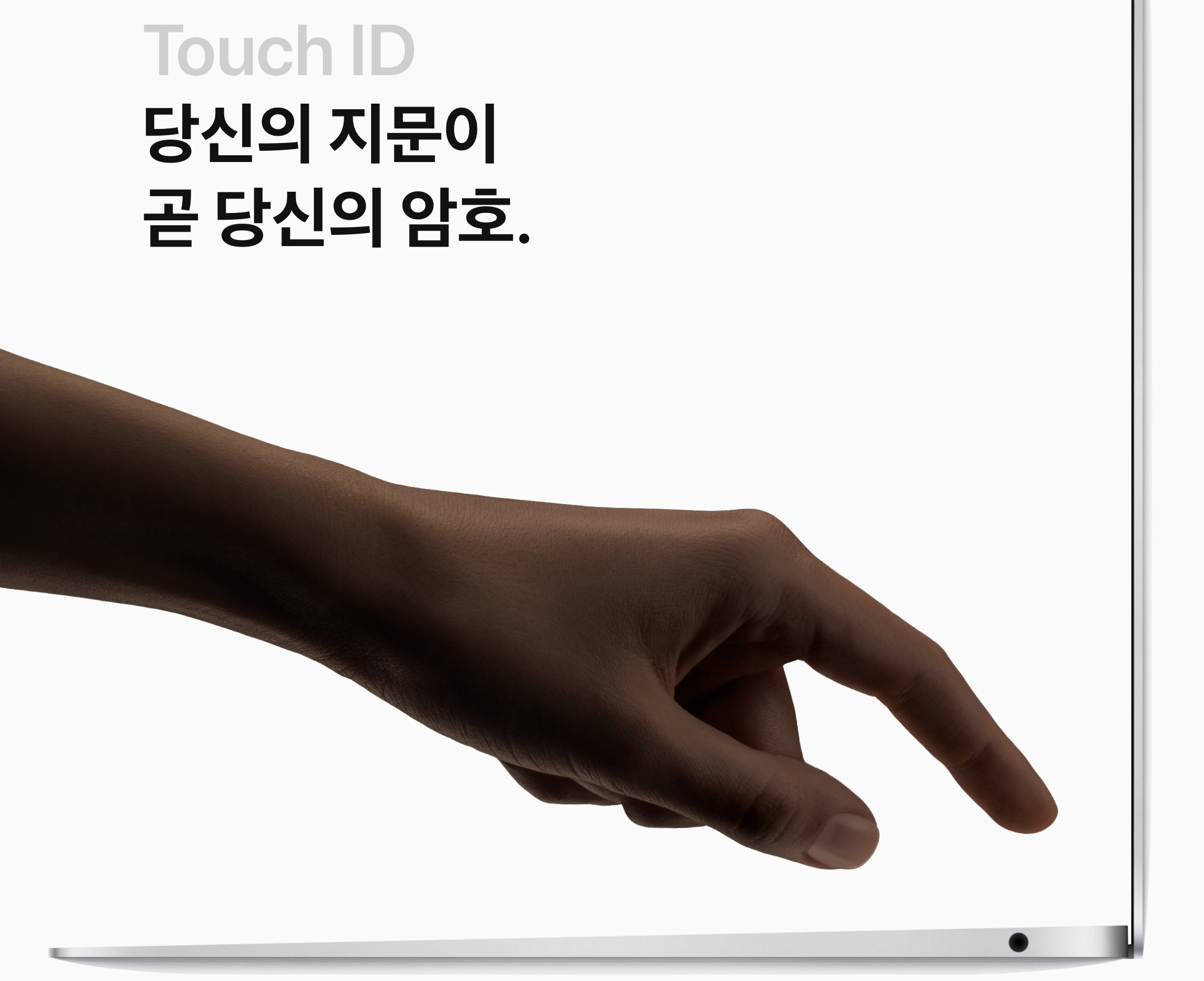 암호 입력 없이 빠르게 맥북 에어를 잠금 해제 할 수 있는 Touch ID 가 탑재되어 있습니다. Touch ID로는 맥북 잠금해제뿐만 아니라 메모 잠금해제, 문서, 시스템 설정들을 모두 지문으로 열 수 있습니다.