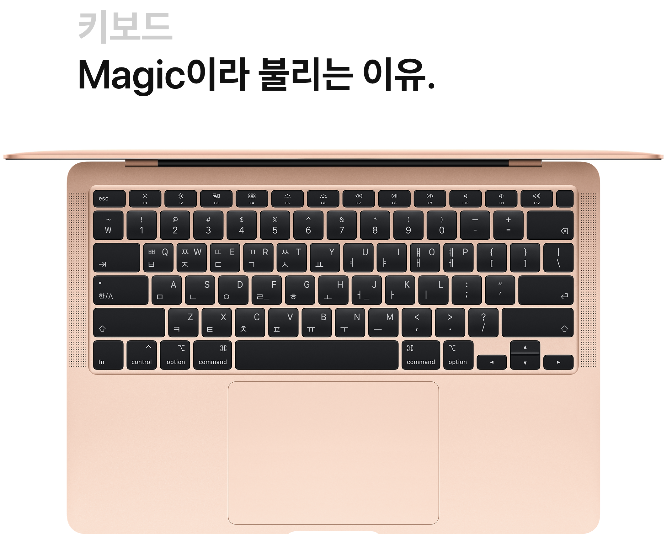 기존 맥북 프로 16인치에서 등장하면서 탑재된 키보는 가위식 매커니즘의 Magic Keyboad 라는 키보드입니다. 맥북 에어에도 가위식으로 변경된, 맥북 프로 16인치와 동일한 Magic Keyboard 탑재되었습니다.