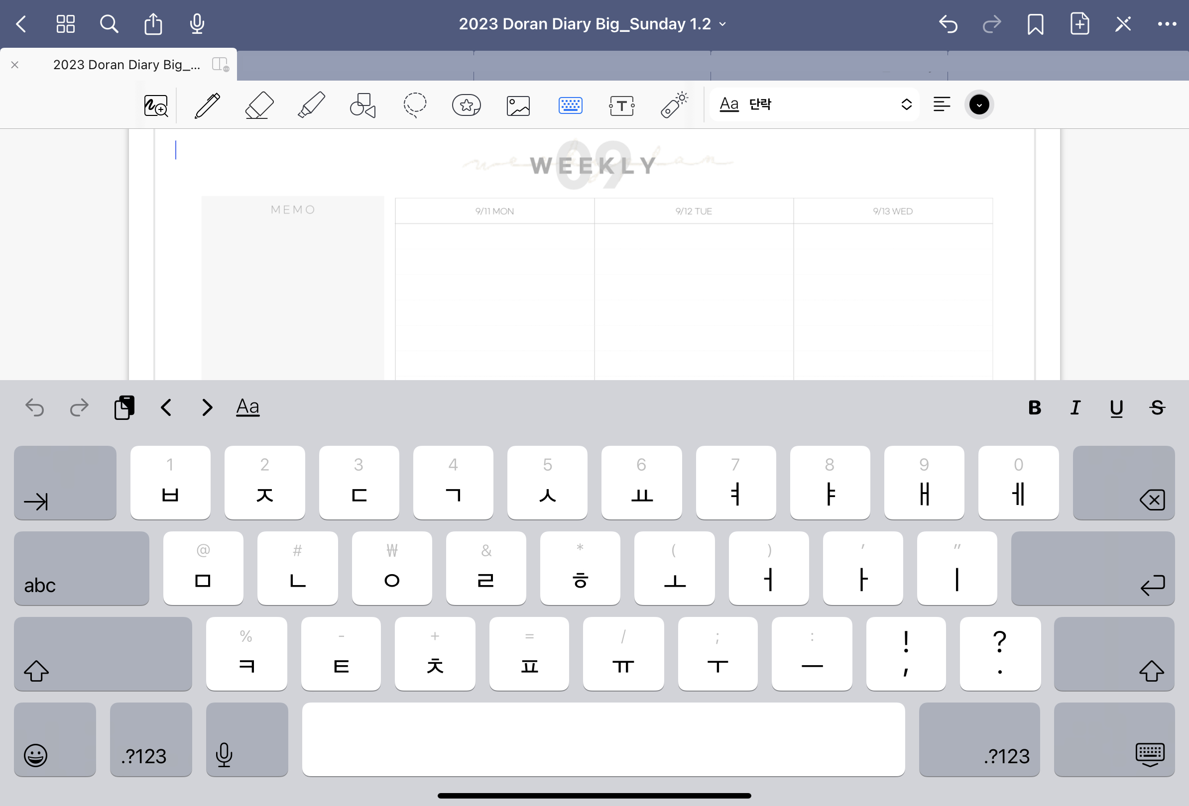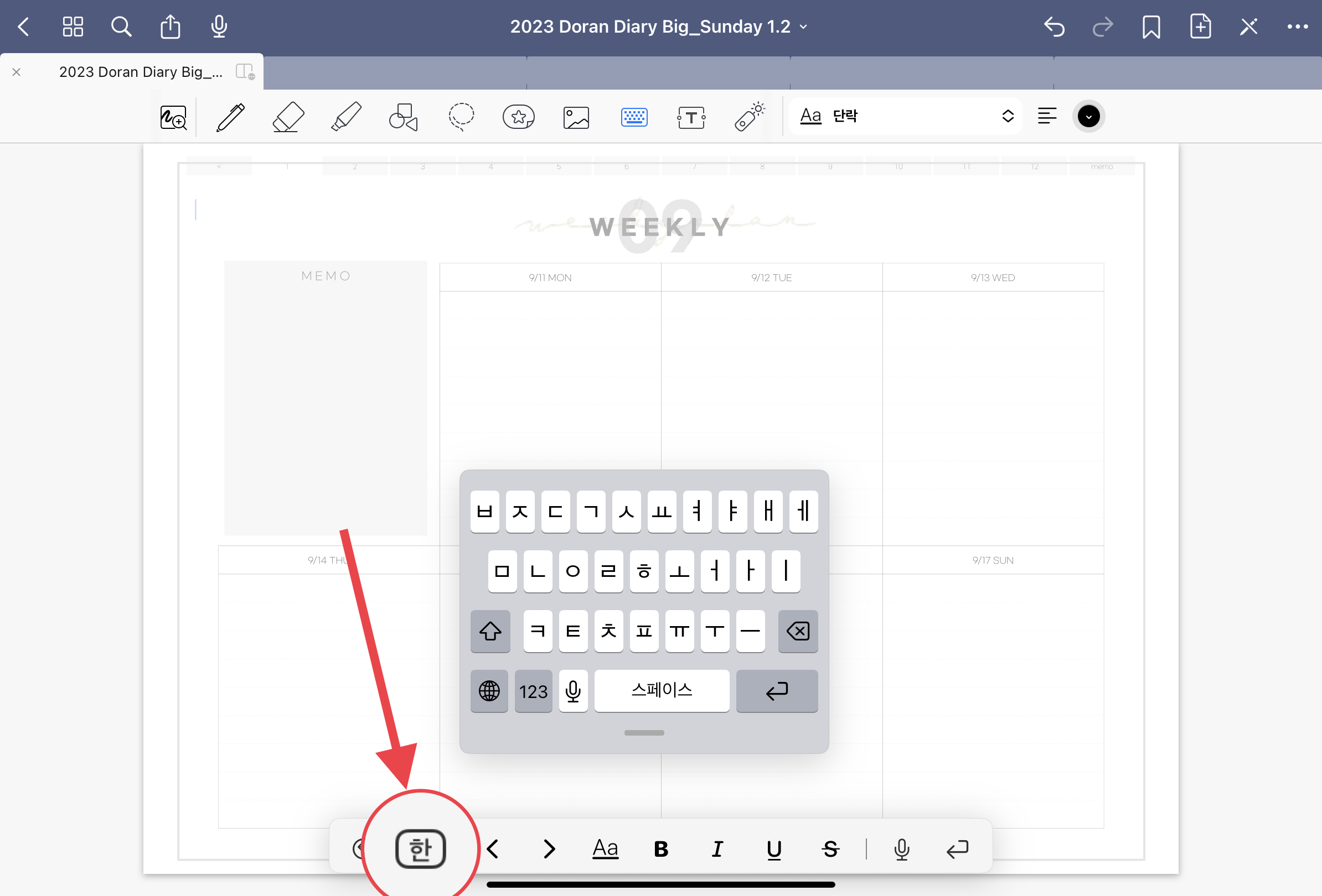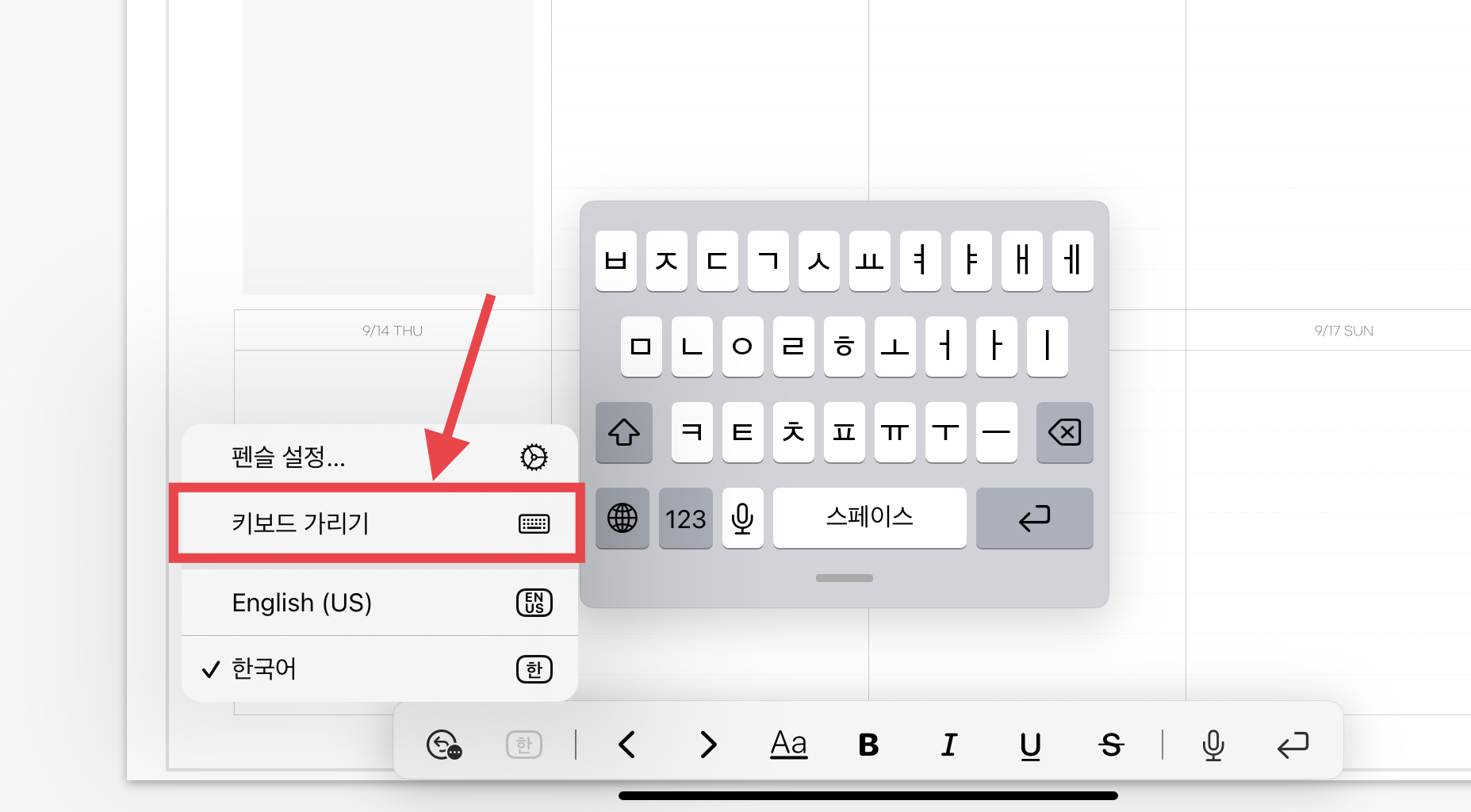 굿노트에서 키보드를 사용하려면 자동으로 유동식 작은 키보드가 나오는데요. 큰 키보드로 고정해서 사용하는 분들을 위해서, 키보드 고정하는 방법을 알아보도록 하겠습니다.