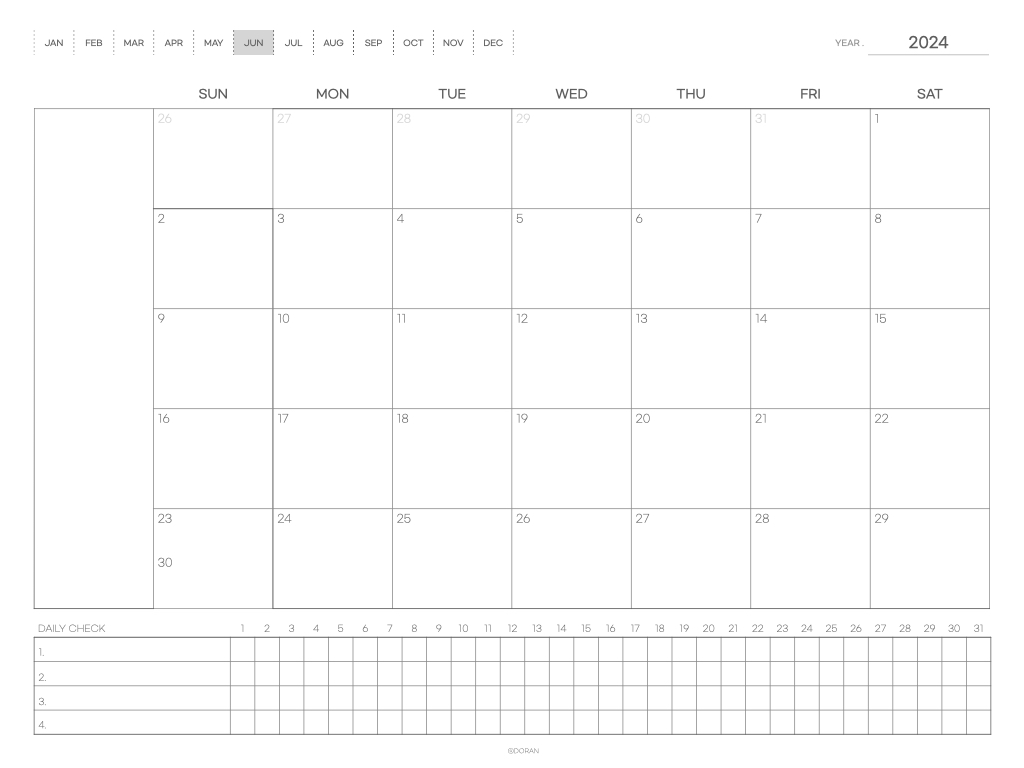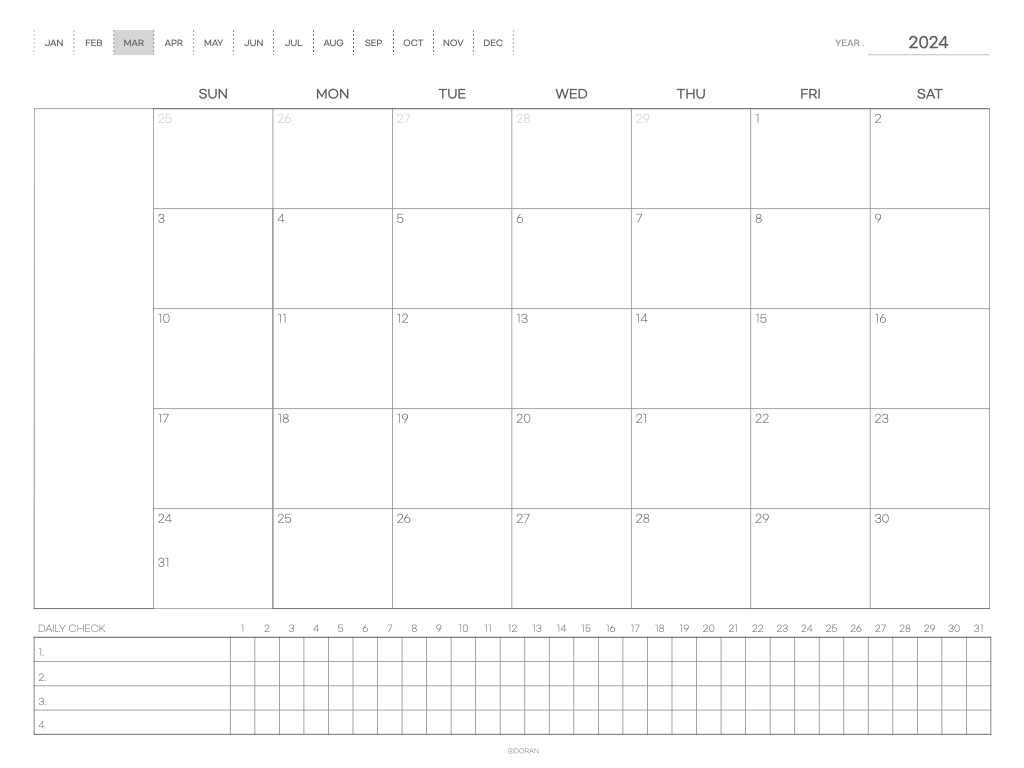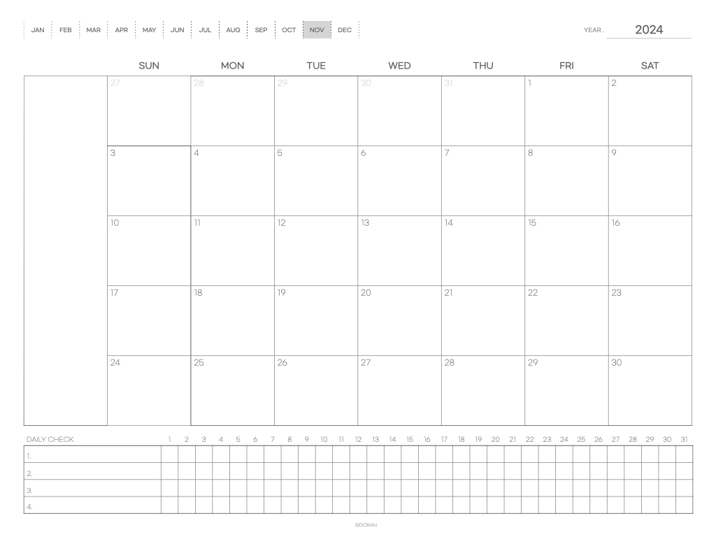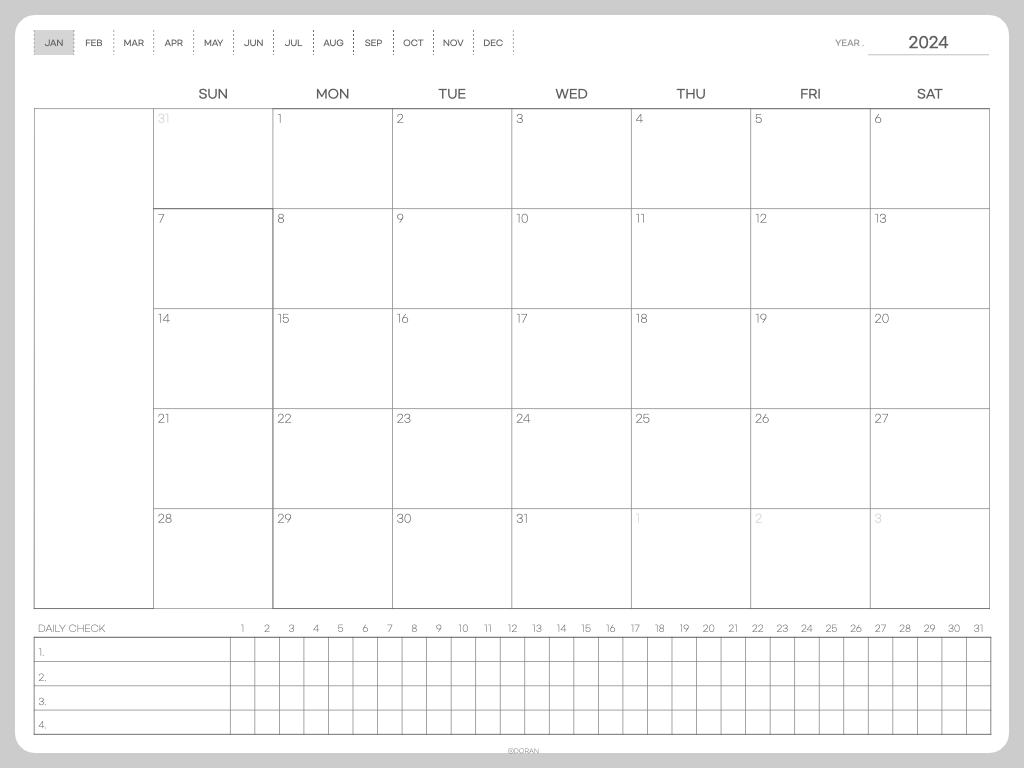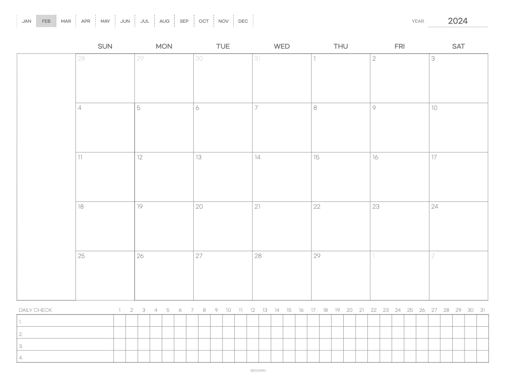 안녕하세요 도란입니다. 오늘은 2024년 먼슬리 다이어리 속지를 가지고 왔습니다. 그 중에서도 가장 최근에 만들어서 공유했던, 데일리 체크 란이 있는 속지 입니다. 매일 실천하고 싶은 습관이 있다면 이 부분에 체크하면 좋을 것 같습니다.