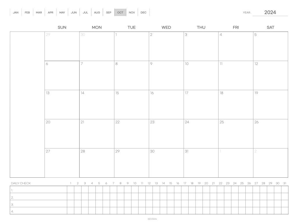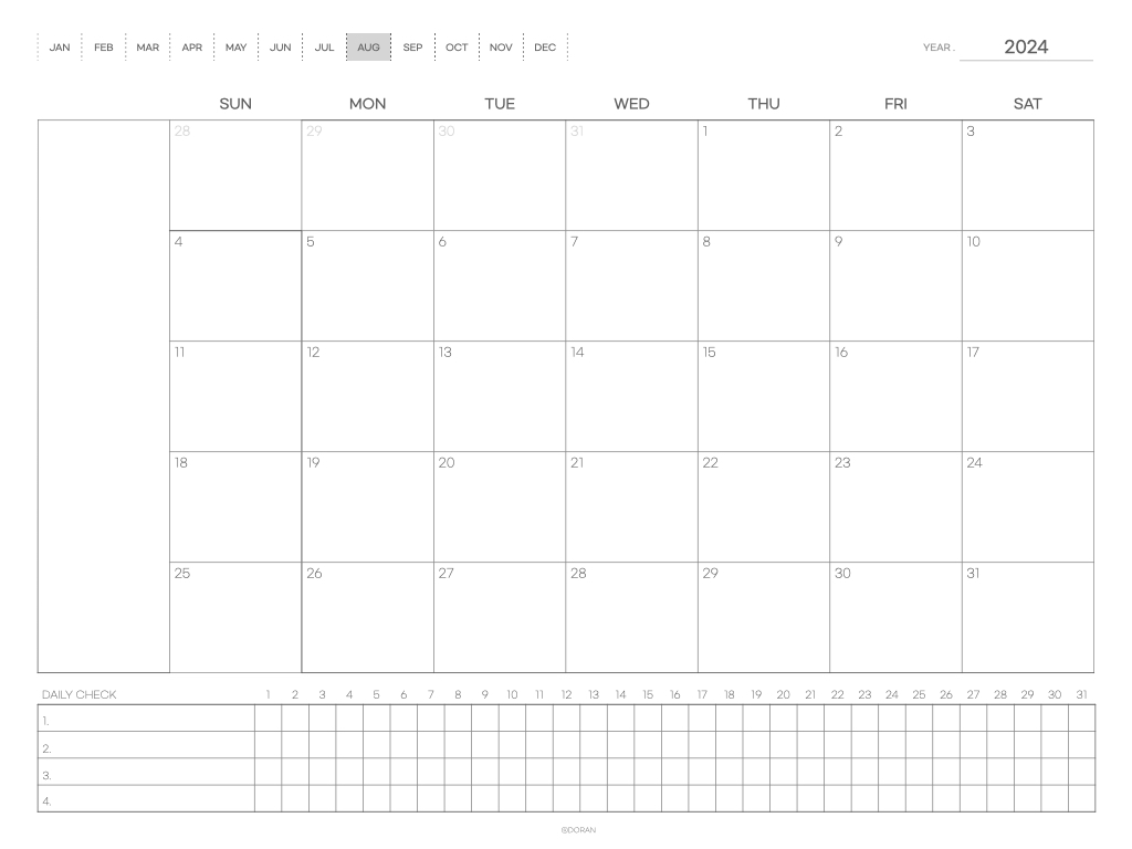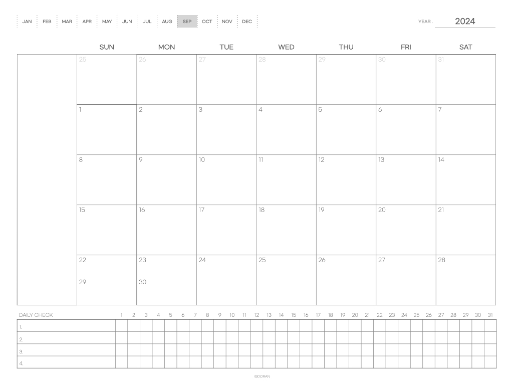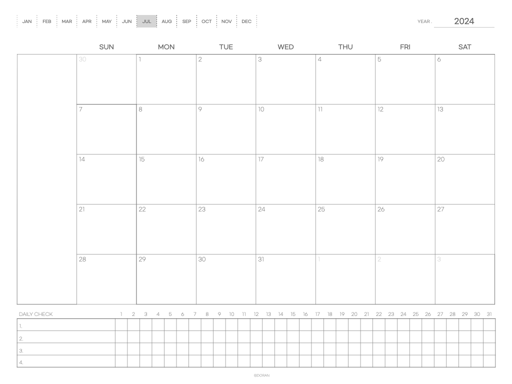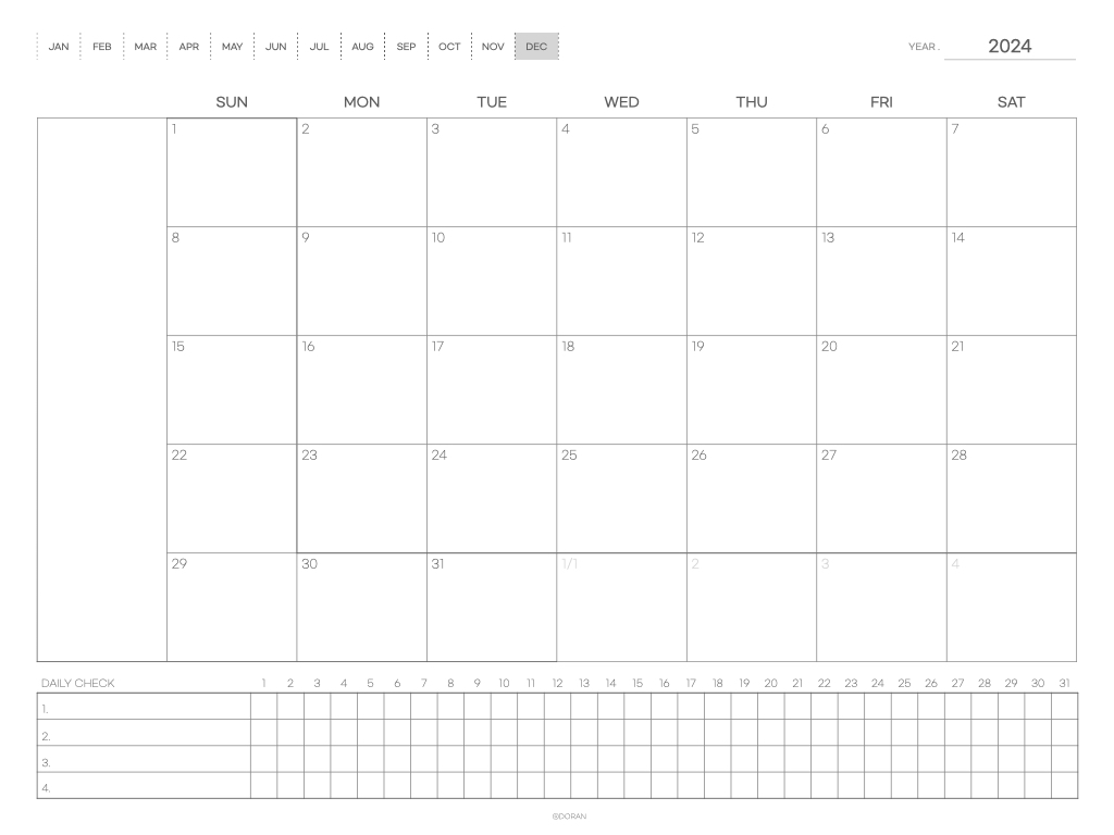 안녕하세요 도란입니다. 오늘은 2024년 먼슬리 다이어리 속지를 가지고 왔습니다. 그 중에서도 가장 최근에 만들어서 공유했던, 데일리 체크 란이 있는 속지 입니다. 매일 실천하고 싶은 습관이 있다면 이 부분에 체크하면 좋을 것 같습니다.
