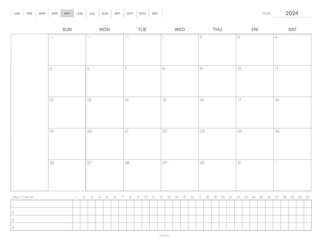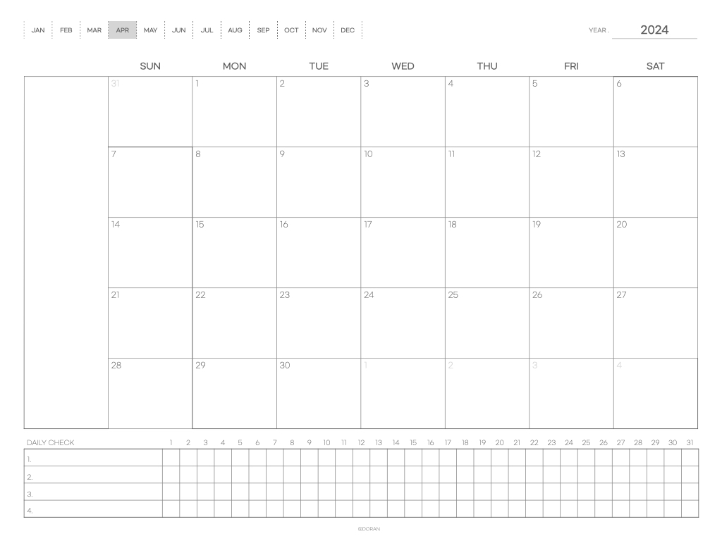 안녕하세요 도란입니다. 오늘은 2024년 먼슬리 다이어리 속지를 가지고 왔습니다. 그 중에서도 가장 최근에 만들어서 공유했던, 데일리 체크 란이 있는 속지 입니다. 매일 실천하고 싶은 습관이 있다면 이 부분에 체크하면 좋을 것 같습니다.