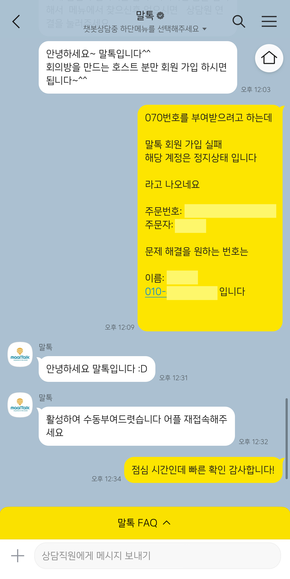 말톡 착신 전화를 하려고 어플을 켰더니, 이렇게 나온다. 분명 저번 해외여행에서는 문제가 없었는데 왜 이럴까. 고객 센터에 연락을 해야 한다고 해서 바로 카카오톡 고객센터에 접속했다.