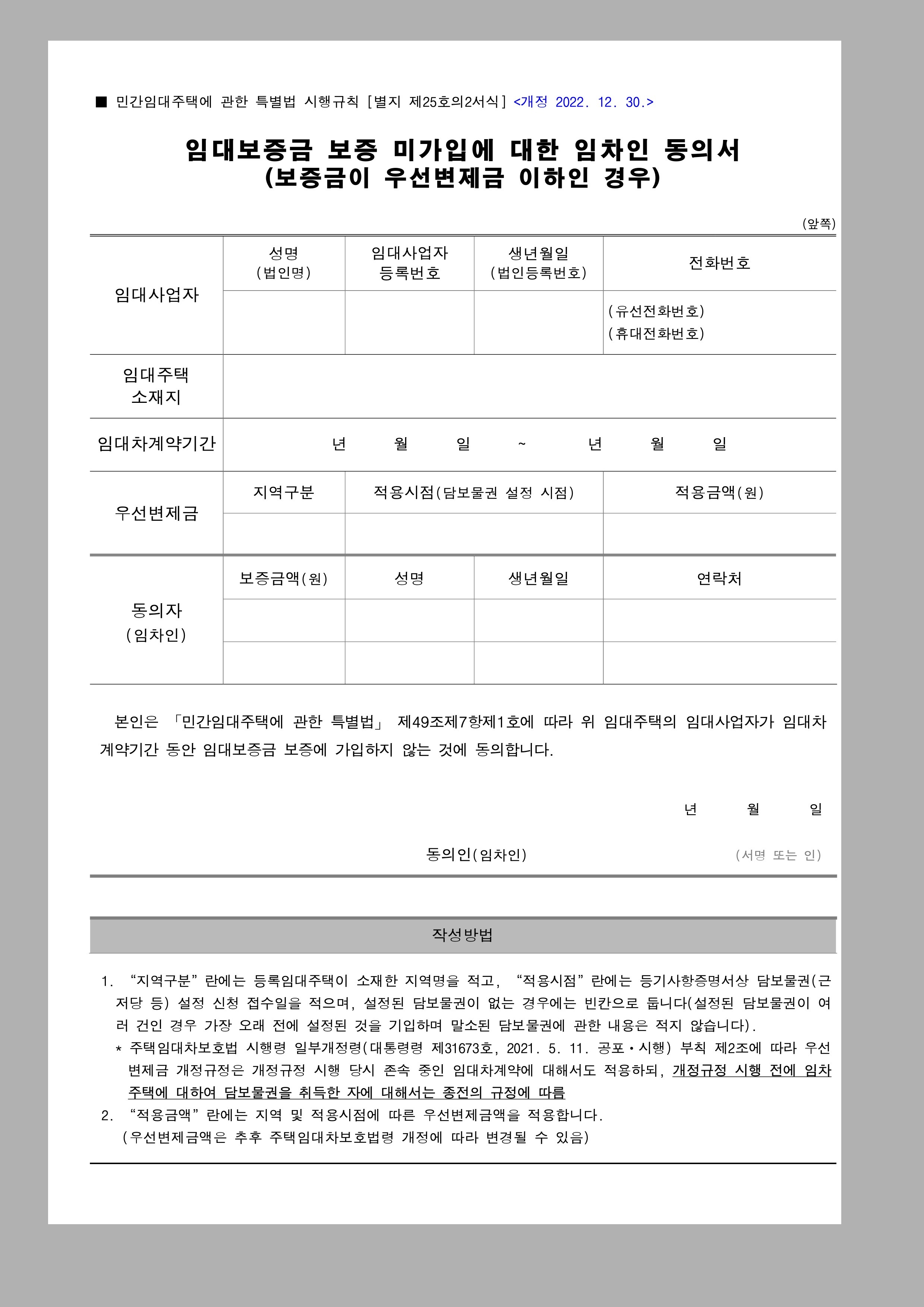 <임대보증금보증 미가입 임차인동의서> 양식 다운로드 한글&PDF(보증금 우선변제금 이하인경..
