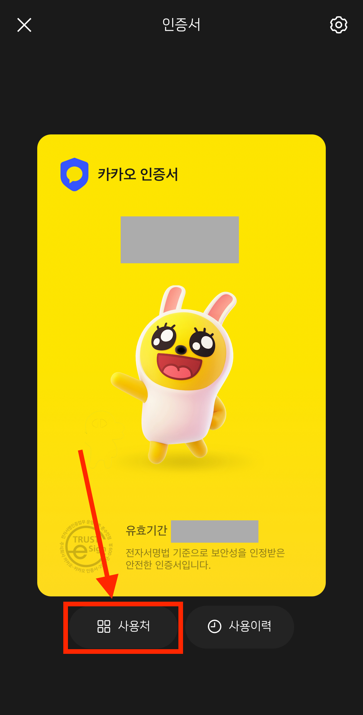 ▼ 카카오톡 인증서가 나오는데요. 카카오 인증서에서 [사용처]를 선택합니다. (만약 카카오 인증서가 없다면 인증서 동의하기를 눌러 카카오 인증서를 만들어 줍니다.)