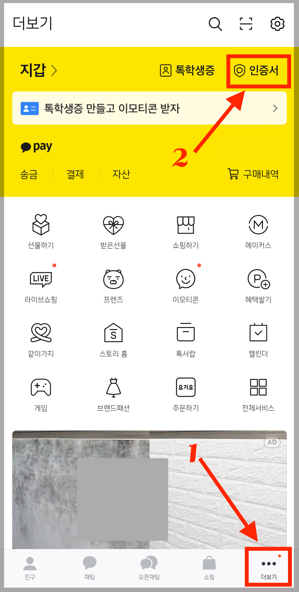 ▼ 오른쪽 맨 아래에 있는 [1.더보기]를 누른 뒤 오른쪽 상단에있는 [2.인증서]를 선택합니다.