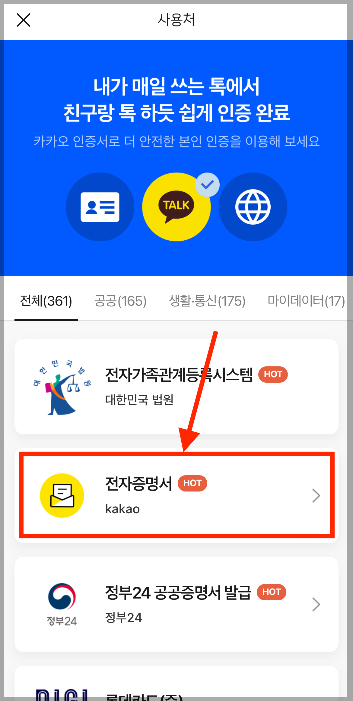 ▼ 카카오톡 인증서가 나오는데요. 카카오 인증서에서 [사용처]를 선택합니다. (만약 카카오 인증서가 없다면 인증서 동의하기를 눌러 카카오 인증서를 만들어 줍니다.)