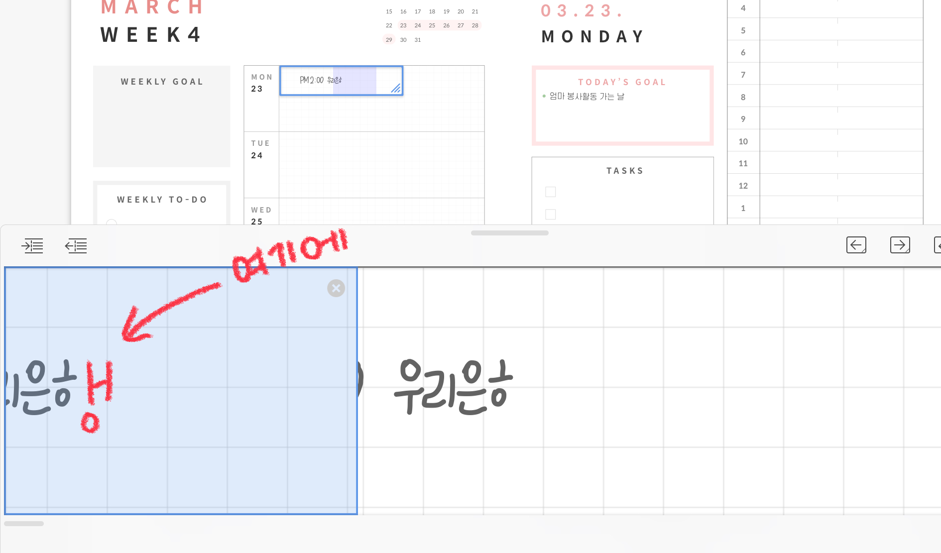오늘은 아이패드 굿노트 확대 도구에 대해서 알아보았습니다. 공부할 때 노트필기에 굉장히 유용하게 사용하고 있습니다. 하지만 다이어리를 꾸밀 때에는 확대 도구를 많이 사용하는 편이 아닙니다. 하지만, 큼직하게 적으면 글씨가 더 잘 적히기 때문에 종종 사용하곤 합니다.