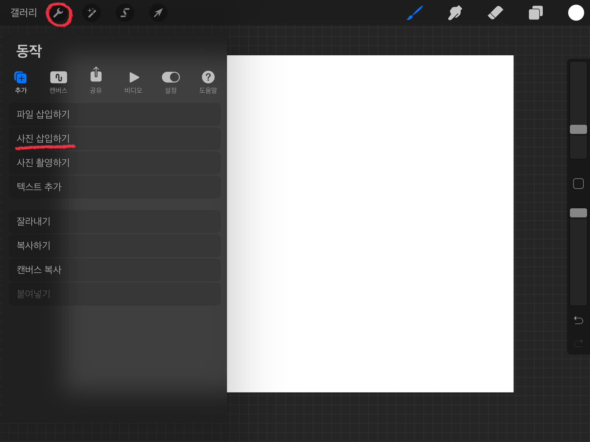 먼저 색상을 추출할 그림 혹은 사진을 아래와 같이 불러옵니다. 저는 [동작] - [사진 삽입하기] 를 눌러서 색을 추출할 사진을 넣어주었습니다. 공구모양 버튼이 [동작] 버튼입니다.