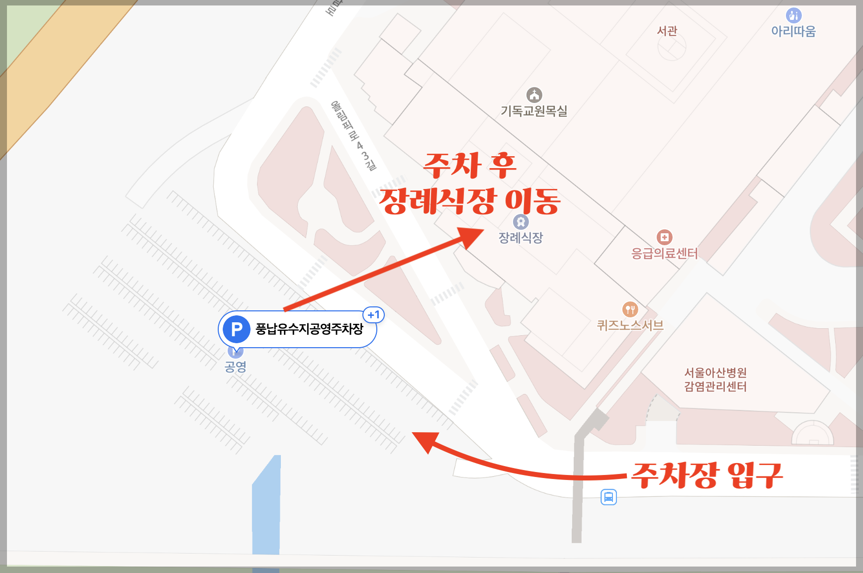 장례식장 간판이 보이면, 바로 직진해서 주차장 입구로 들어가야 한다. 그냥 우회전 하면 후진하거나 다시 돌아와야한다.