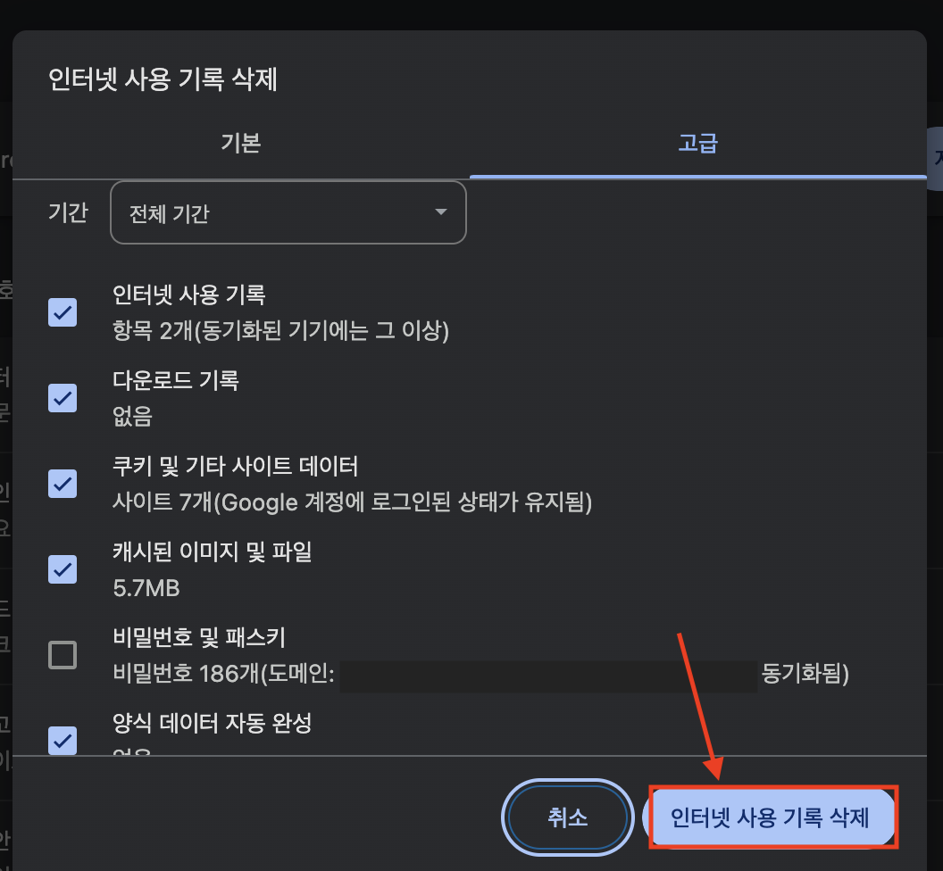 나는 [고급] 탭에서 크롬에 저장해둔 비밀번호 및 패스키를 제외하고, 전부 [인터넷 사용기록 삭제]를 해주었다.