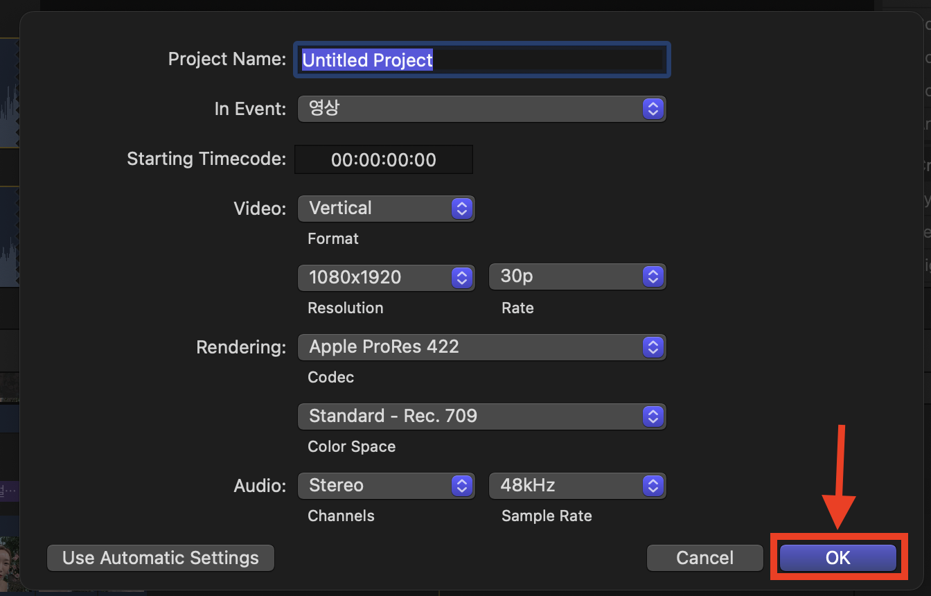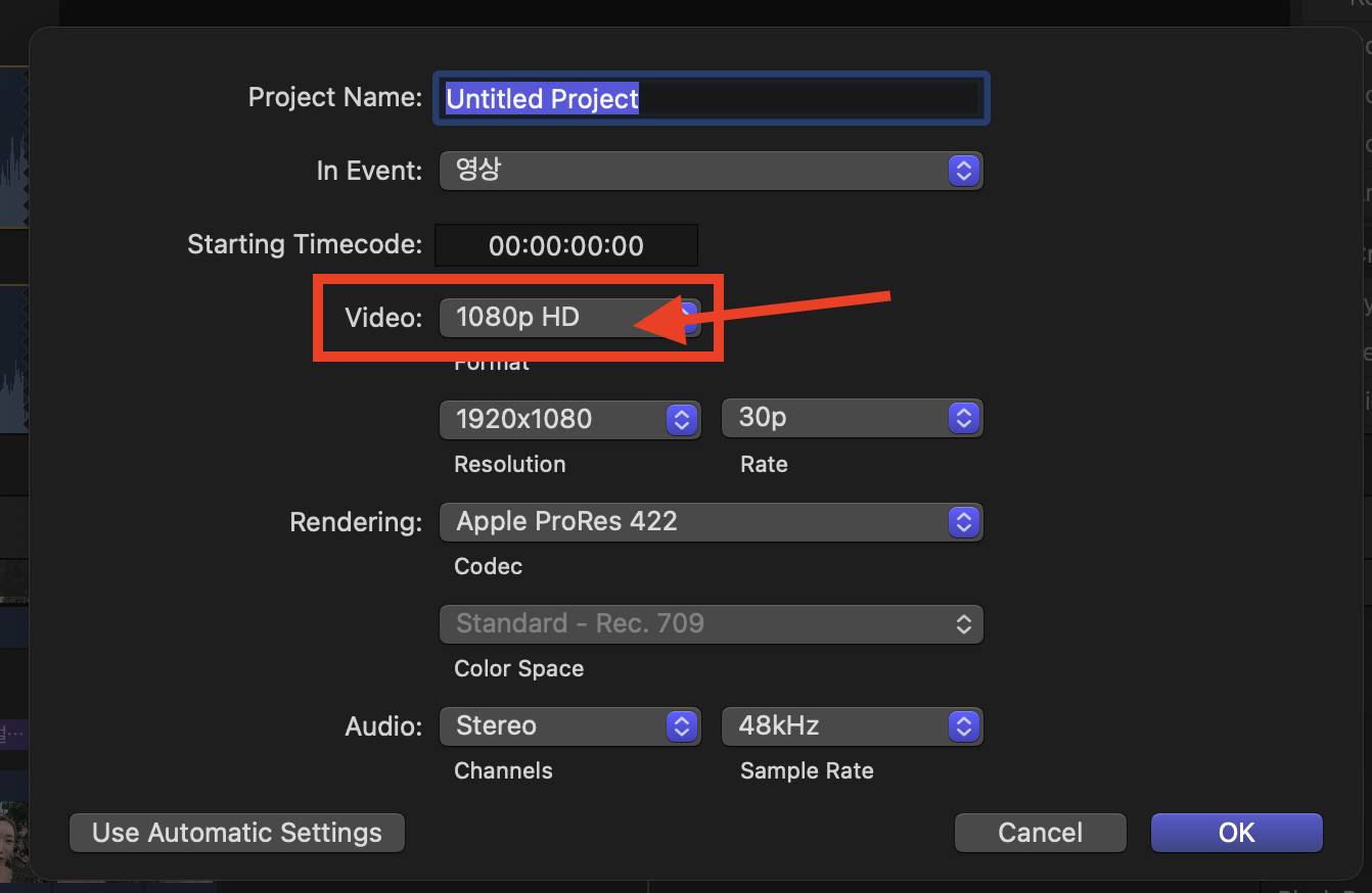 파이널 컷에서 쇼츠 영상을 만들기 위해서는 기본적인 프로젝트가 세로 방향이 되어야 한다. 사이즈는 1080x1920 이다. 파이널 컷에서 영상을 세로로 세팅하는 방법을 알아보겠다.