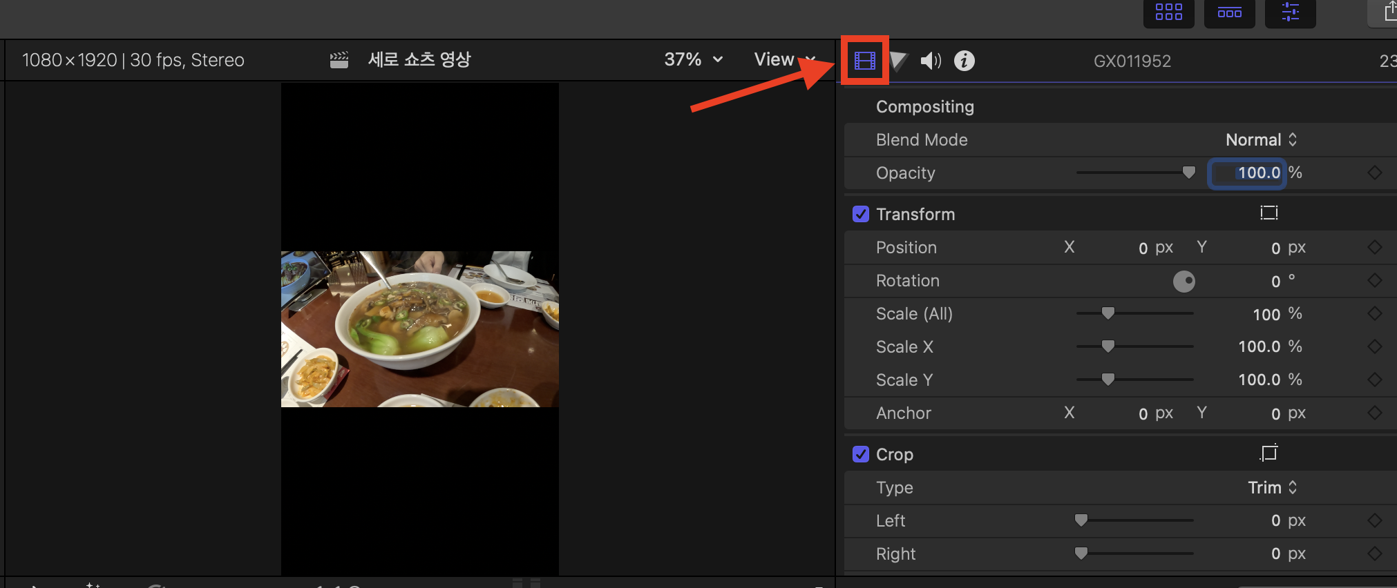 크기를 키우고자 하는 영상을 선택한 뒤, 오른쪽 필름 모양의 [Inspector] 창을 선택한다.