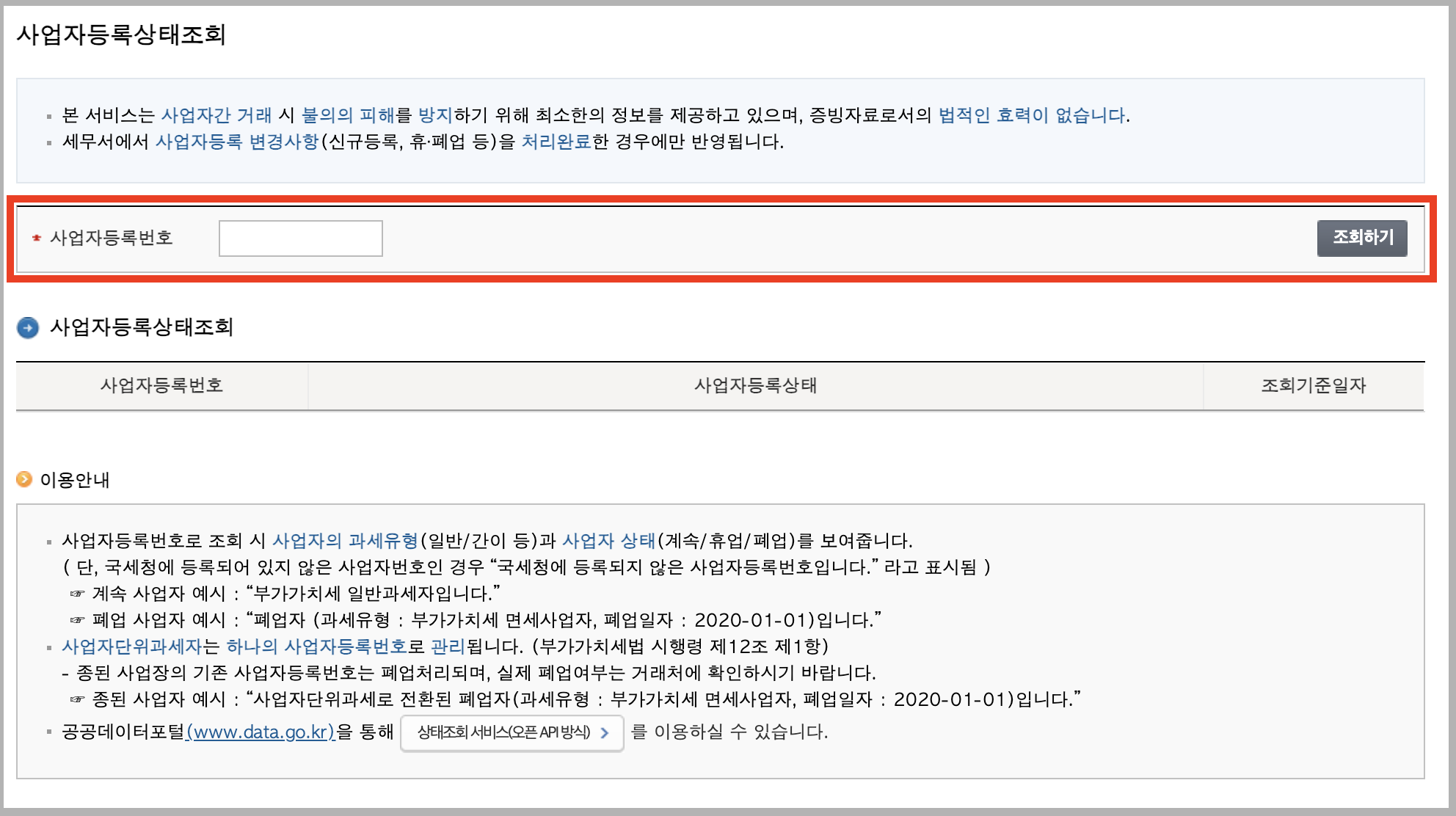 사업자등록 번호로도 조회할 수 있고, 주민등록번호로도 조회할 수 있습니다.