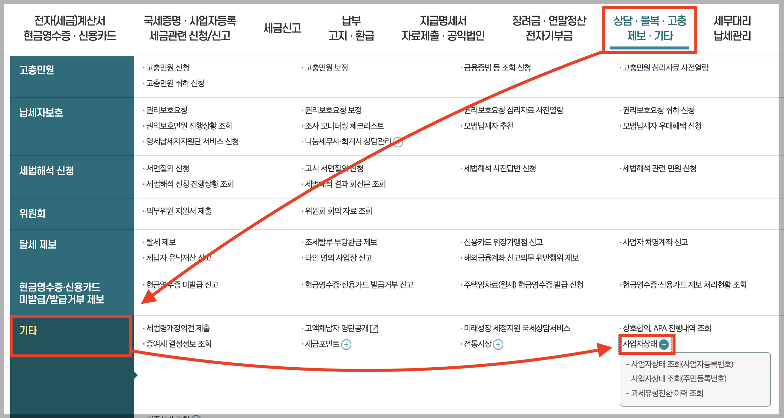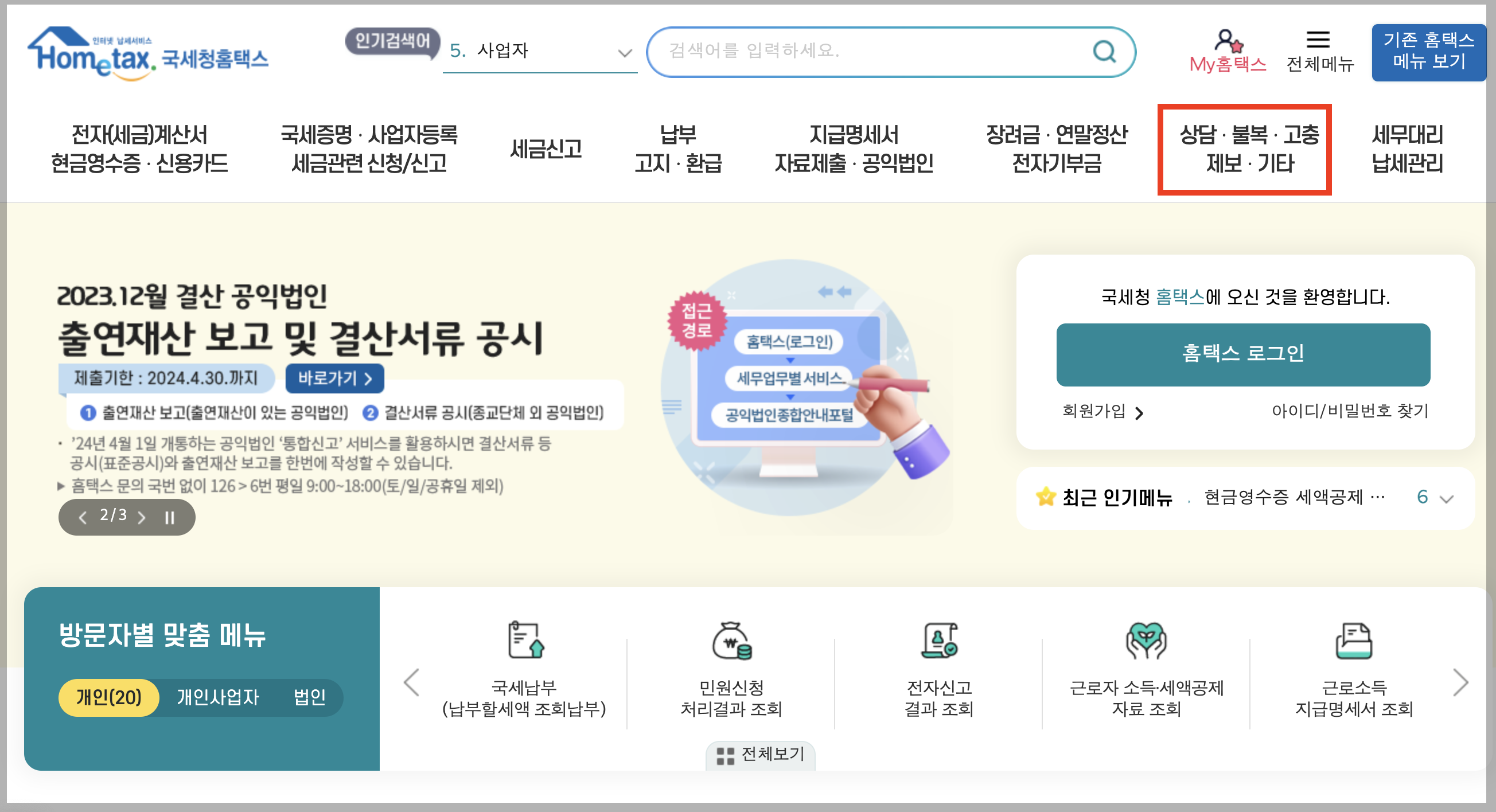 홈택스에 접속하면 상단 메뉴에서 [상담·불복·고충·제보·기타] 메뉴로 들어갑니다.