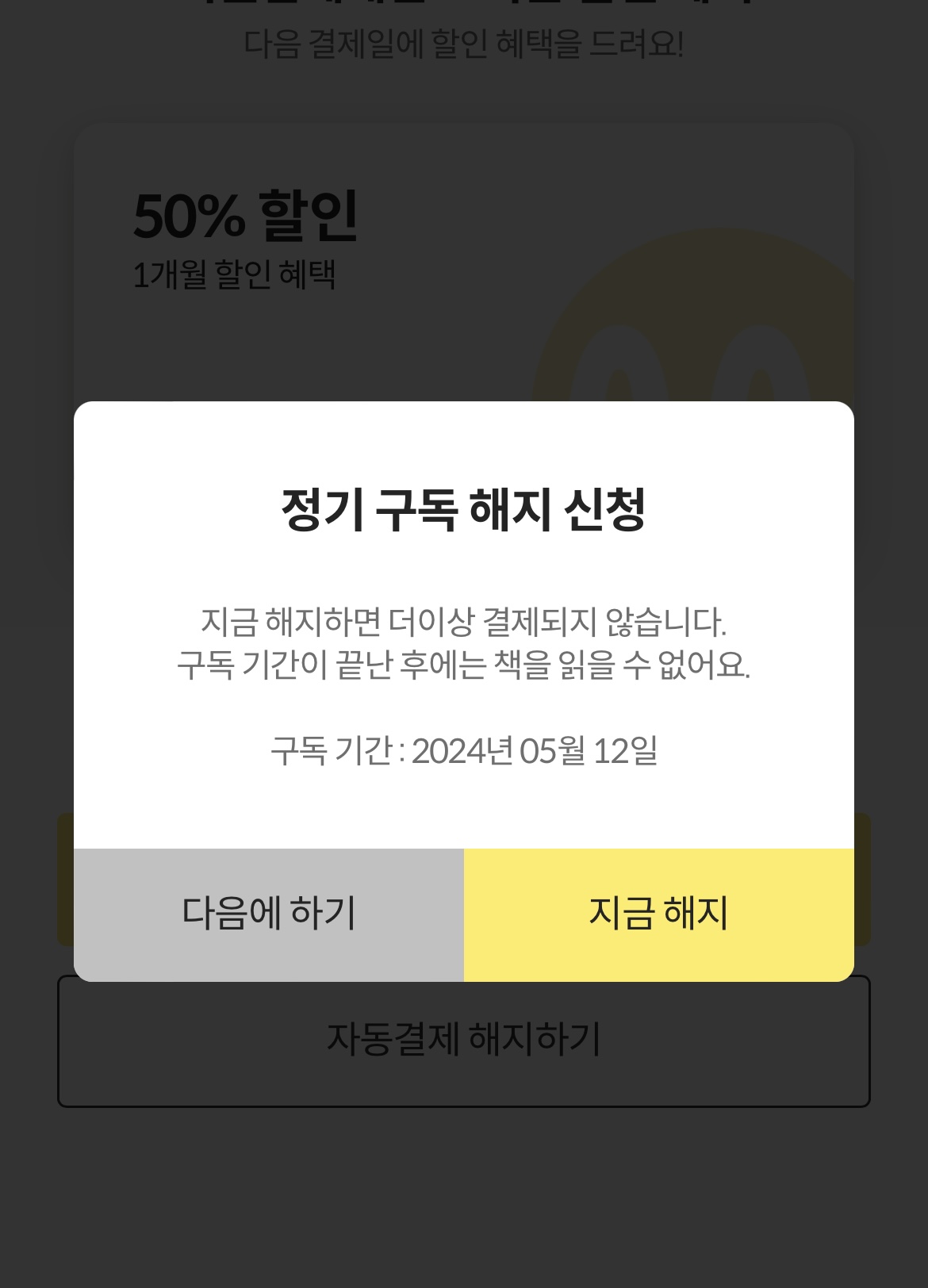 저는 KT 장기 혜택 쿠폰으로 밀리의 서재를 이용할 수 있어서, 해지를 했는데요. 쿠폰을 다 사용하고 난 뒤에 다시 결제를 해야겠습니다.