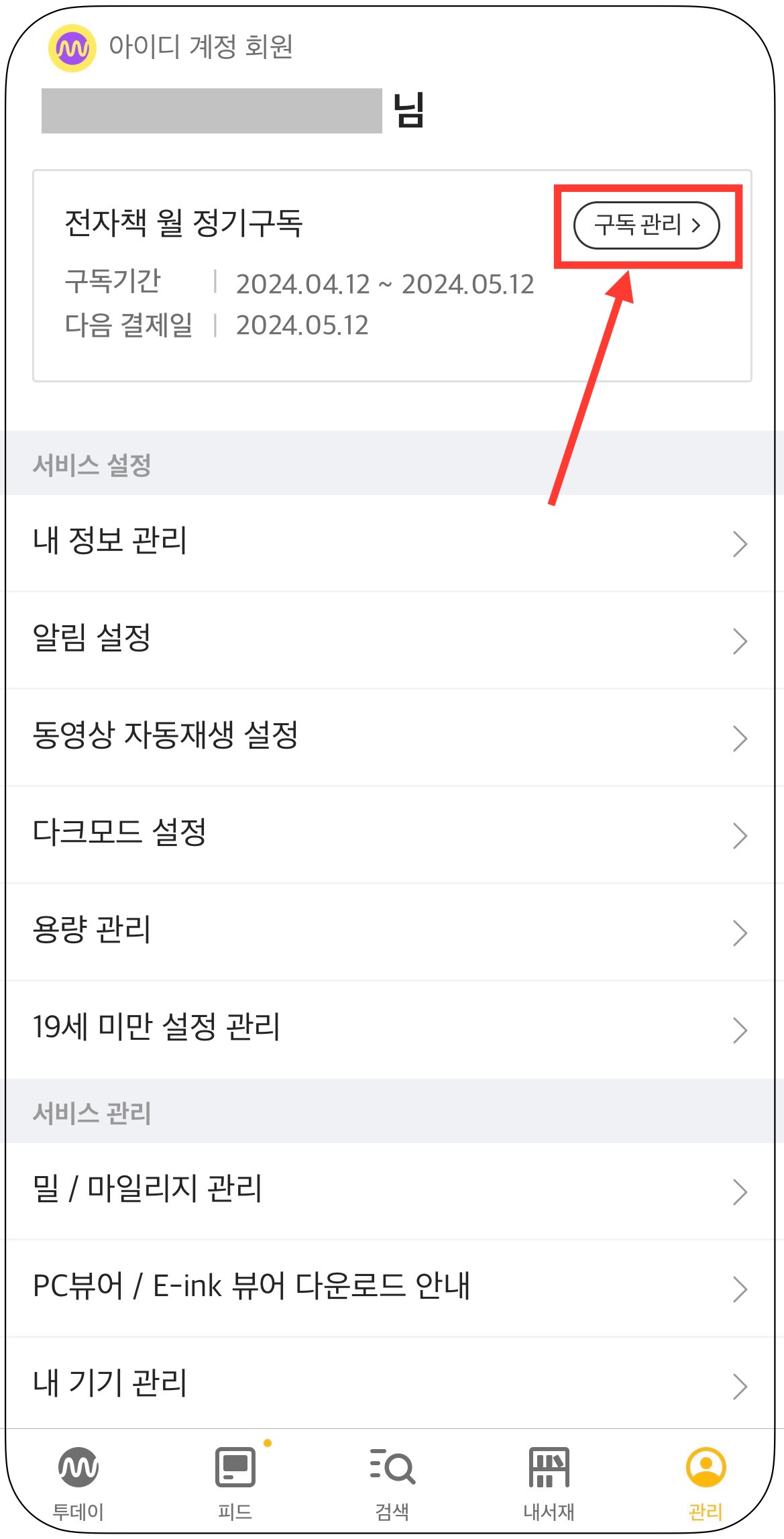 ▼ 밀리의서재 어플에서 맨 오른쪽에 있는 [관리] 메뉴에 들어가서, 상단에 있는 [구독 관리]를 눌러줍니다.