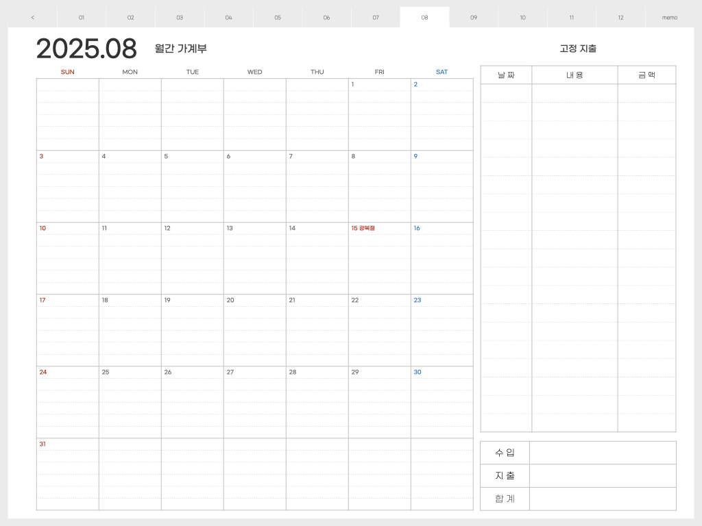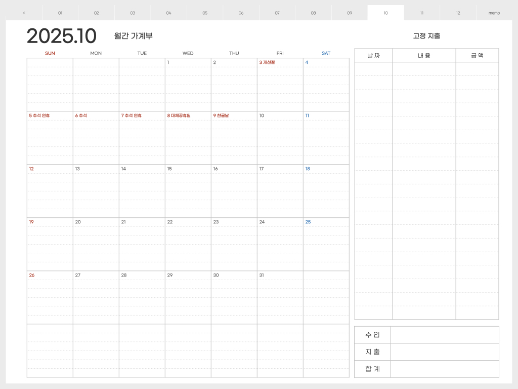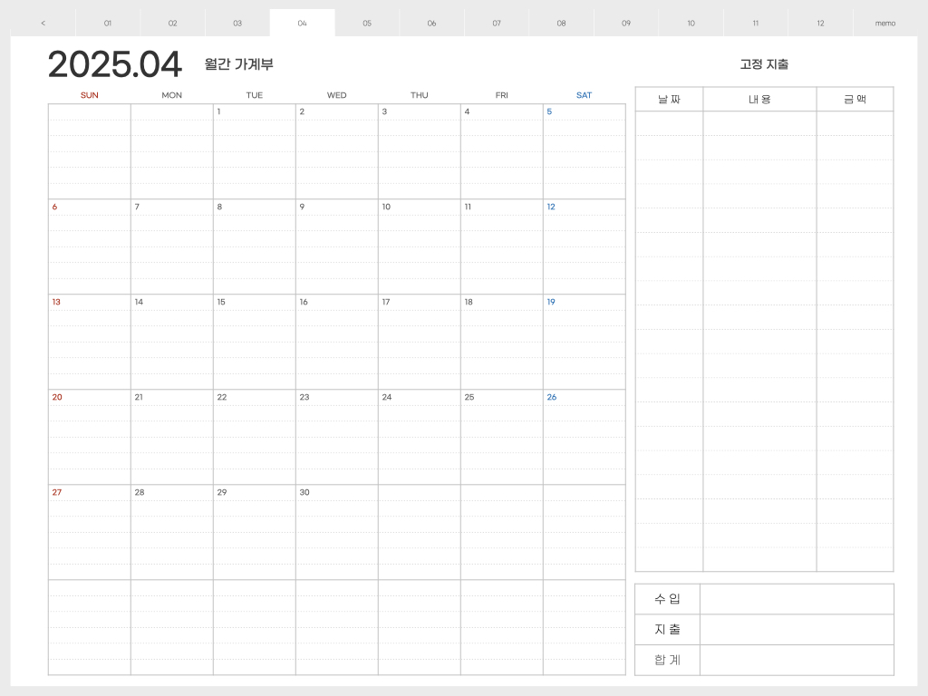 오른쪽에는 고정지출을 적어놓고, 캘린더 부분에는 날짜별 지출을 적어 놓으면 됩니다. 한달 총 수입과 지출을 한 눈에 볼 수 있기 때문에 가계부 적는 습관을 만들면, 지출을 전반적으로 관리하기가 쉬워지는 것 같습니다.