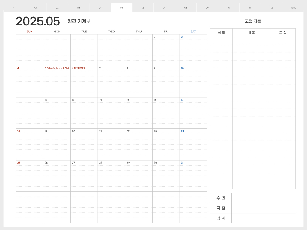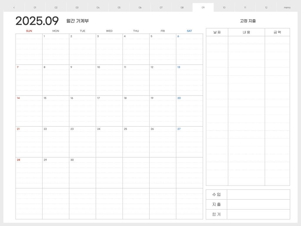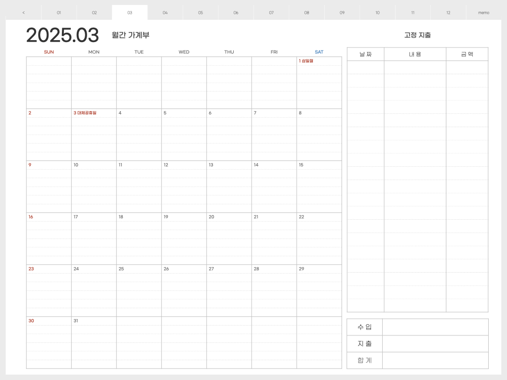 오른쪽에는 고정지출을 적어놓고, 캘린더 부분에는 날짜별 지출을 적어 놓으면 됩니다. 한달 총 수입과 지출을 한 눈에 볼 수 있기 때문에 가계부 적는 습관을 만들면, 지출을 전반적으로 관리하기가 쉬워지는 것 같습니다.