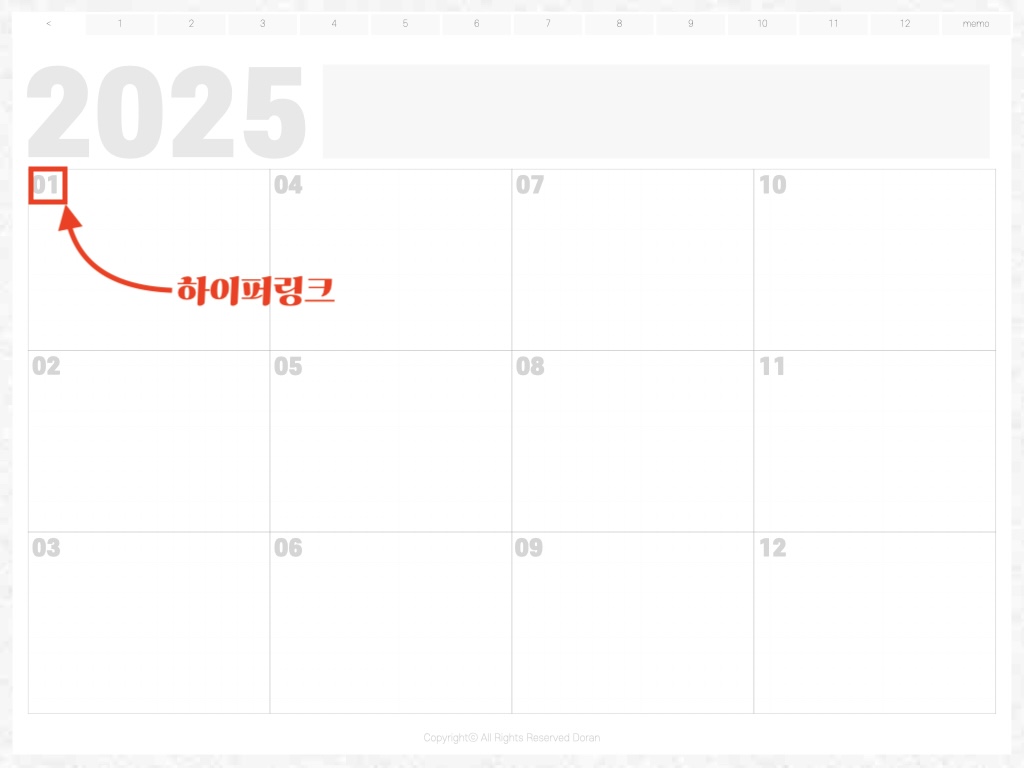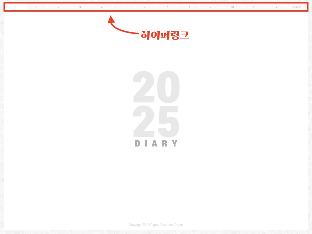 표지 상단은 물론, 모든 속지 페이지의 상단에는 각 월로 이동할 수 있는 하이퍼링크가 적용되어있습니다.