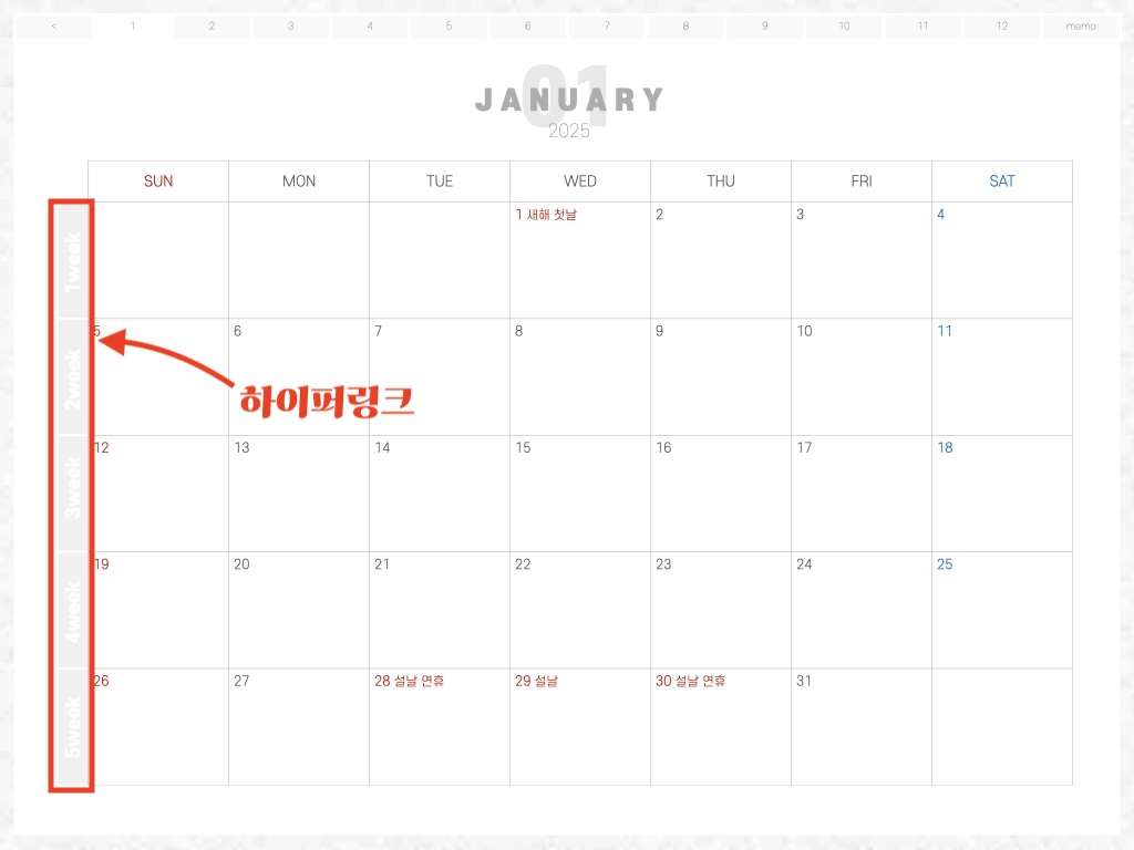 위클리 페이지에는 해당 월로 갈 수 있는 하이퍼링크와, 상단 하이퍼링크가 있으니 원하는 대로 이용하시면 될것 같습니다.