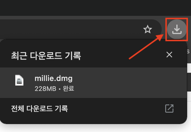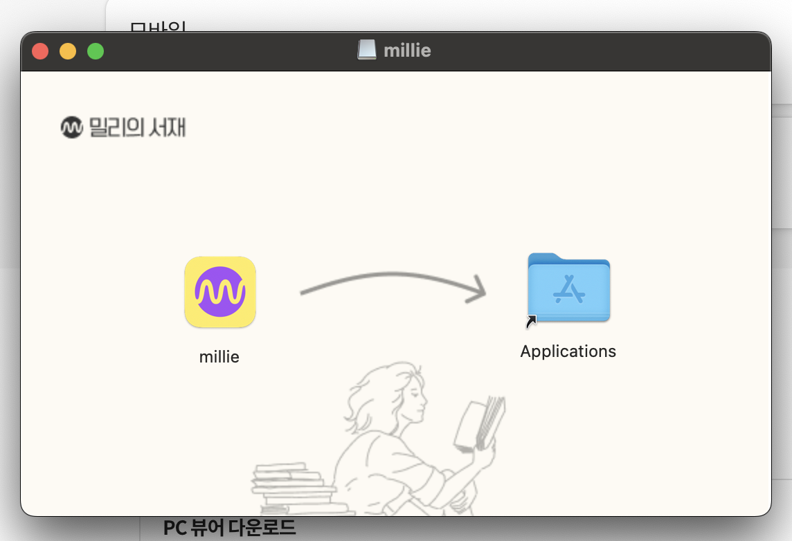설치 파일인 dmg를 실행하면 아래와 같은 화면이 나오고, 밀리의 서재 아이콘을 드래그 해서 폴더로 넣어줍니다.