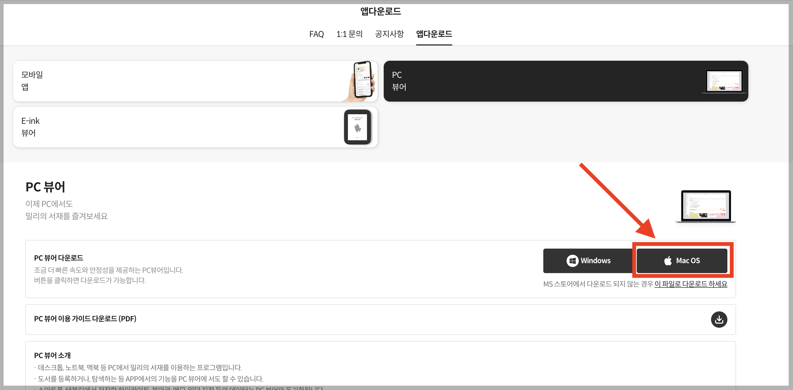 밀리의 서재 홈페이지에서 상단 [관리] - [고객센터] - [앱다운로드] 순서로 들어가면 아래와 같은 페이지가 나옵니다. 위에있는 링크로 들어가도 바로 나옵니다.