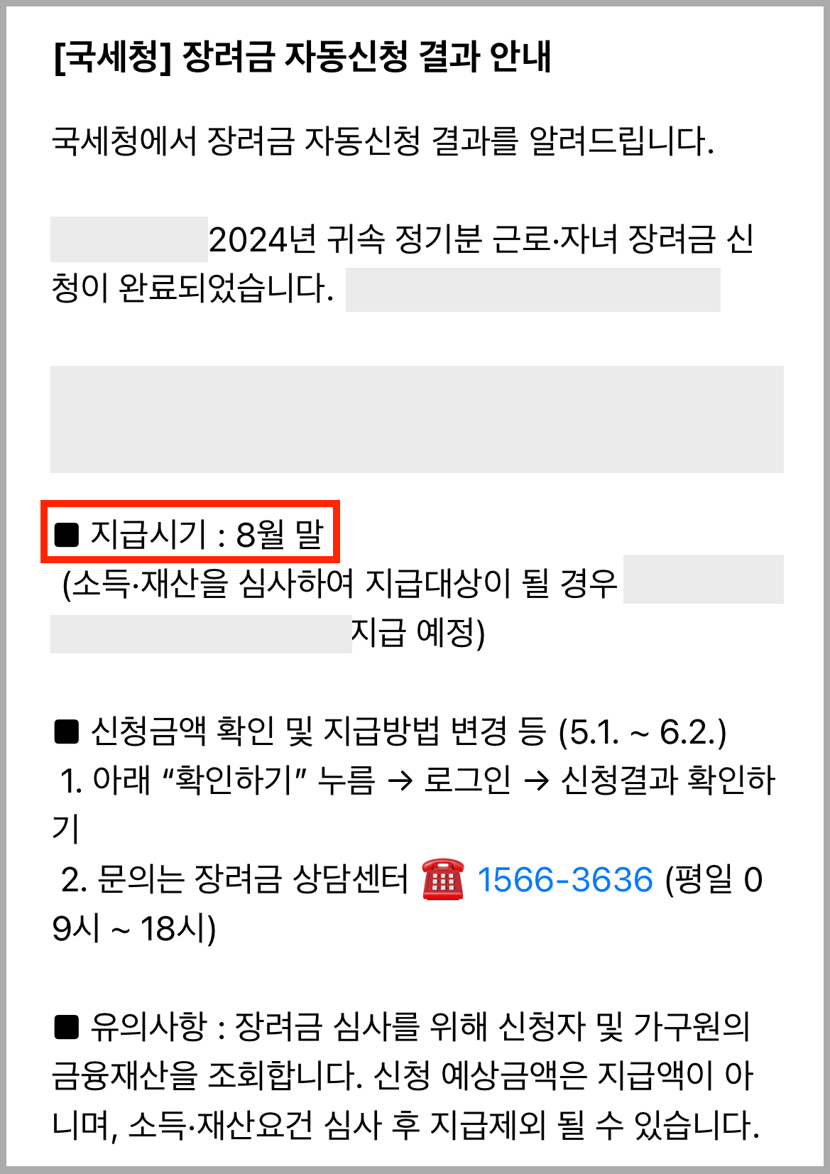 지난 5월에 근로장려금을 신청했을 때, 신청 결과 안내문에 지급시기가 적혀있었는데. 지급시기는 8월 말이라고 되어있었다.