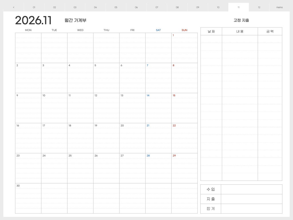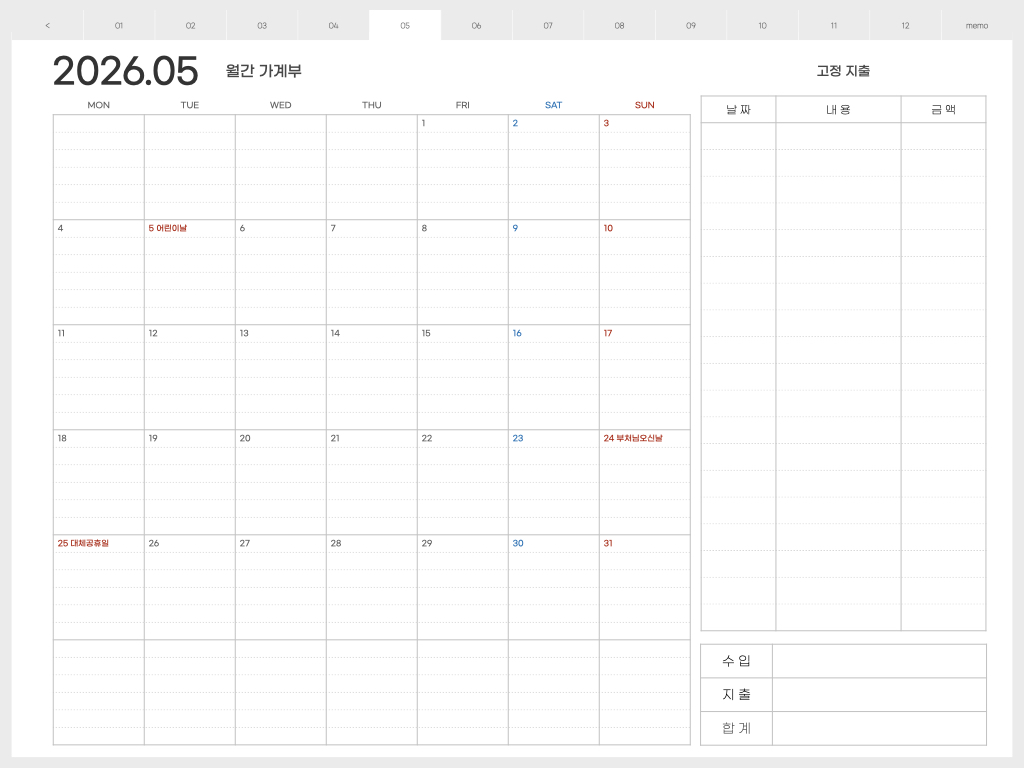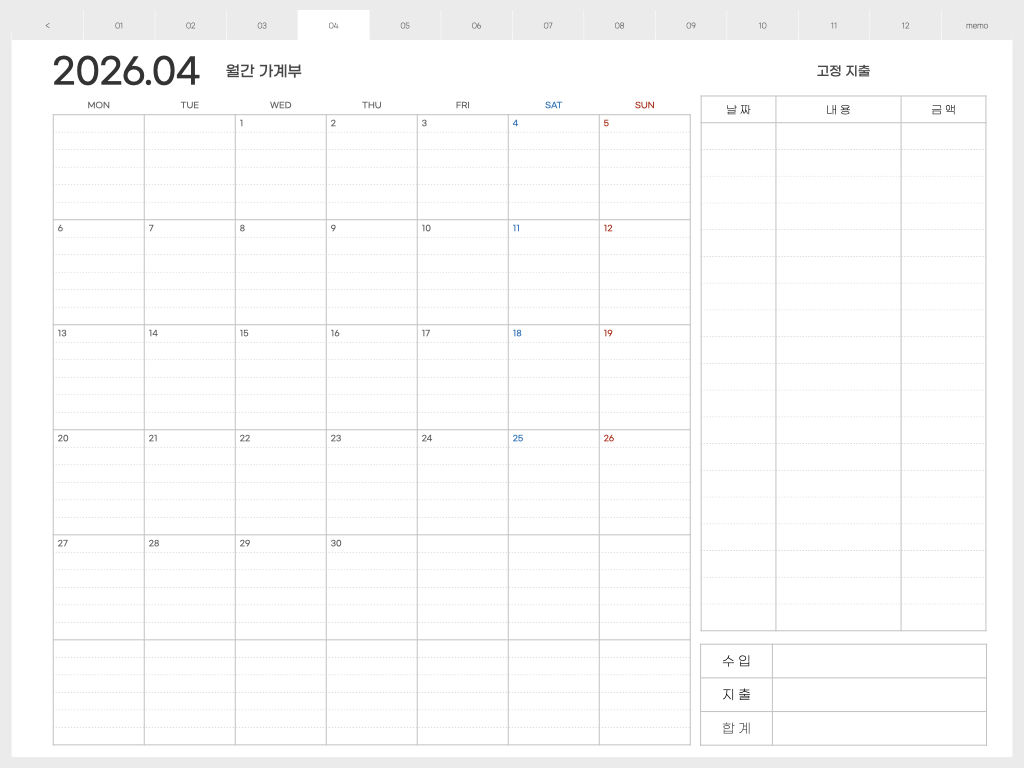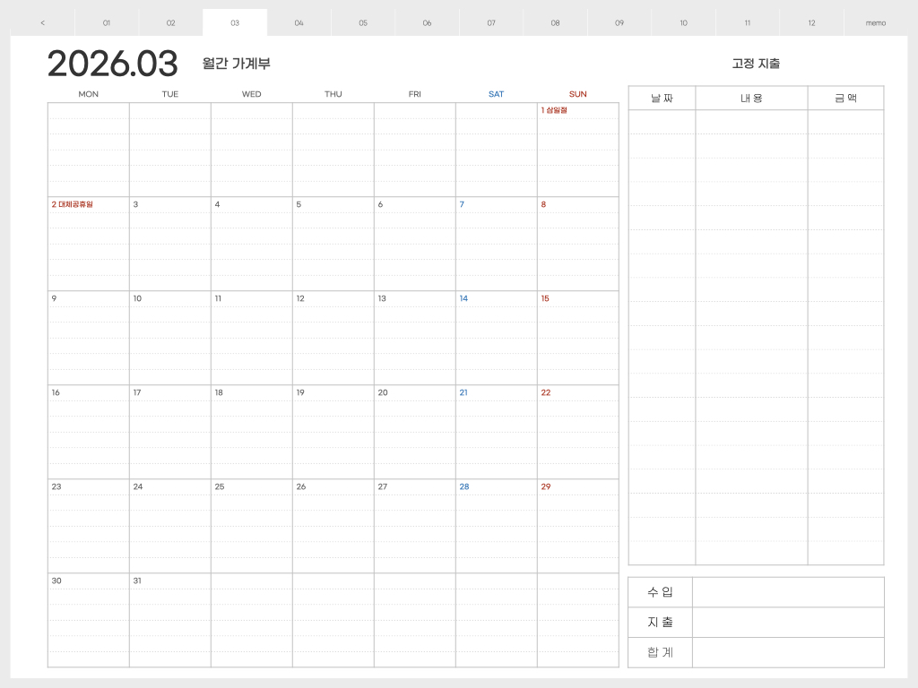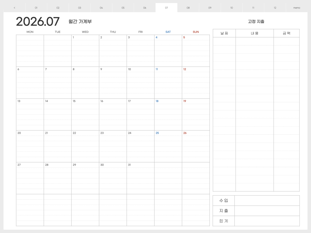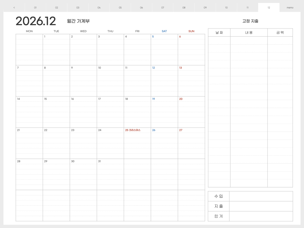 ▽ 가계부 <월요일 시작> 버전